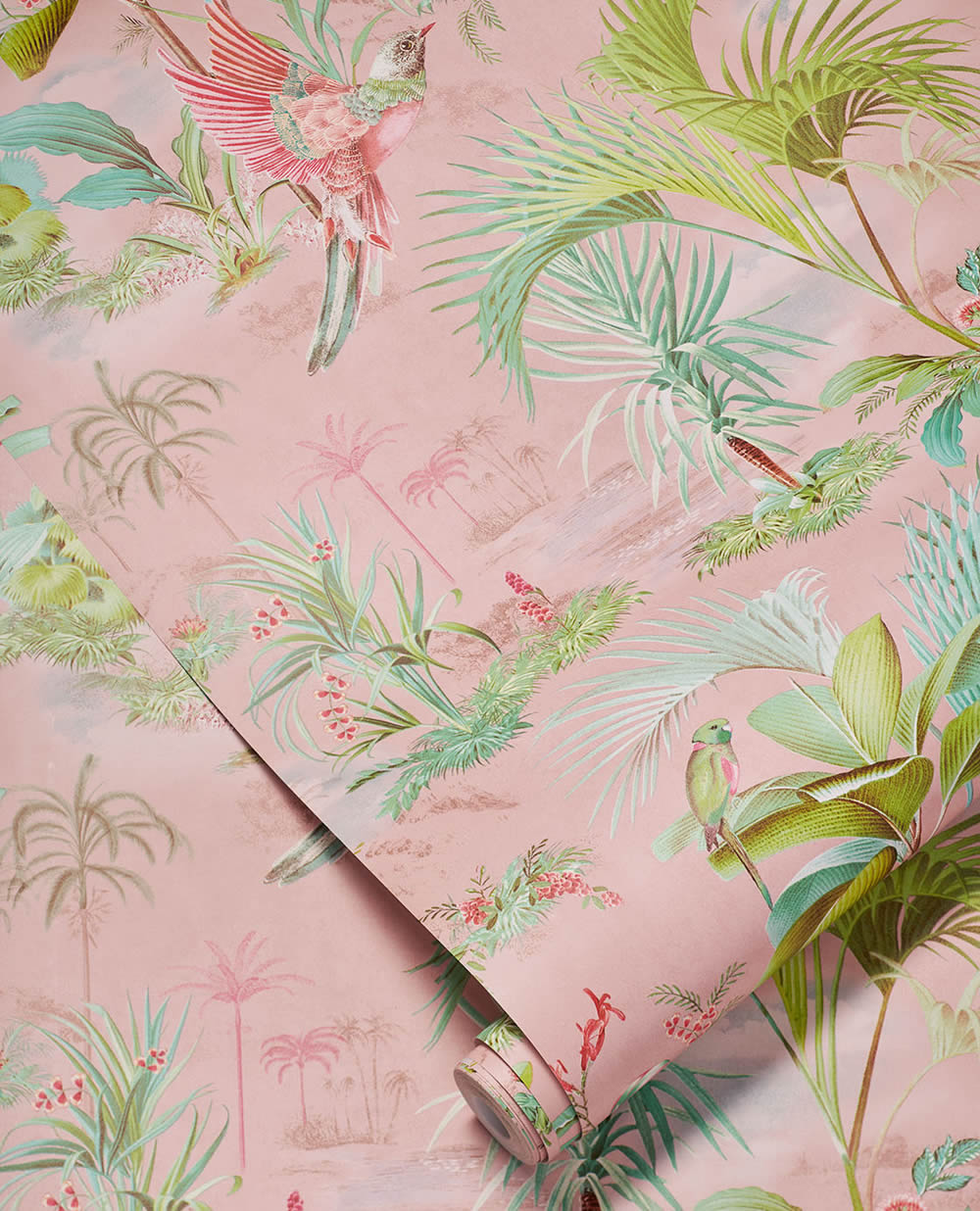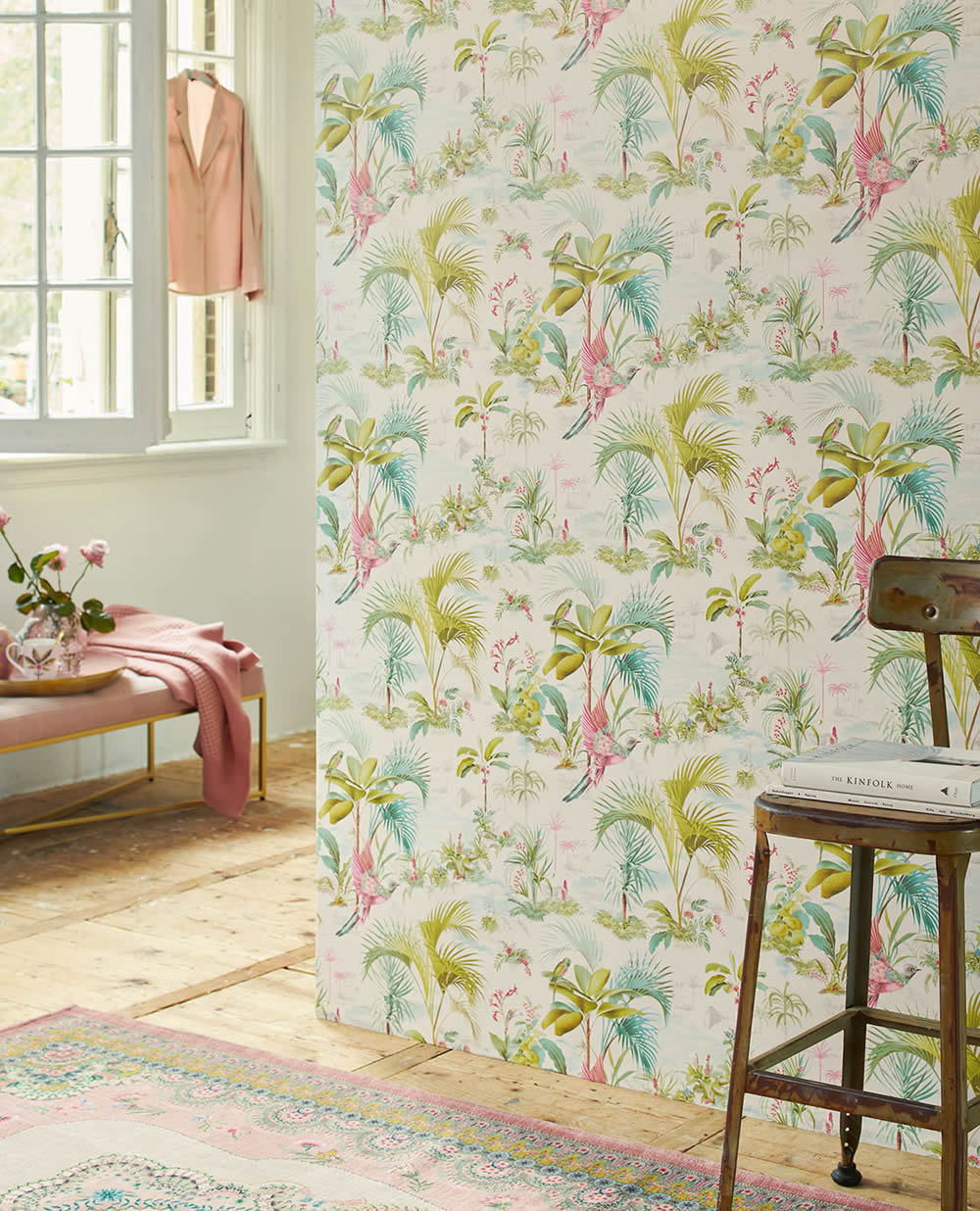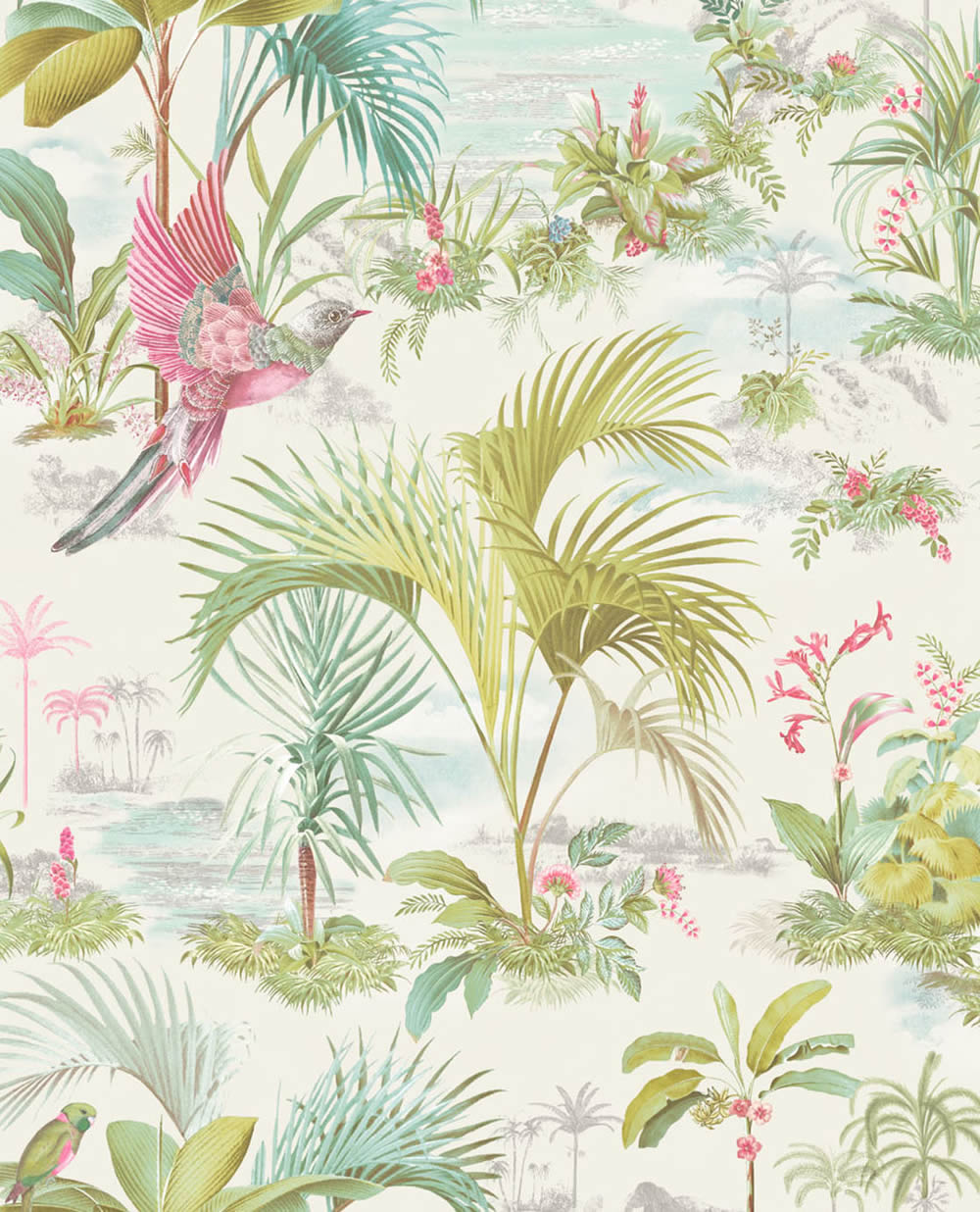 Vliestapete, matt, glatt, Kinderzimmer, Palmenblätter, Vögel, grün, pink, gelb