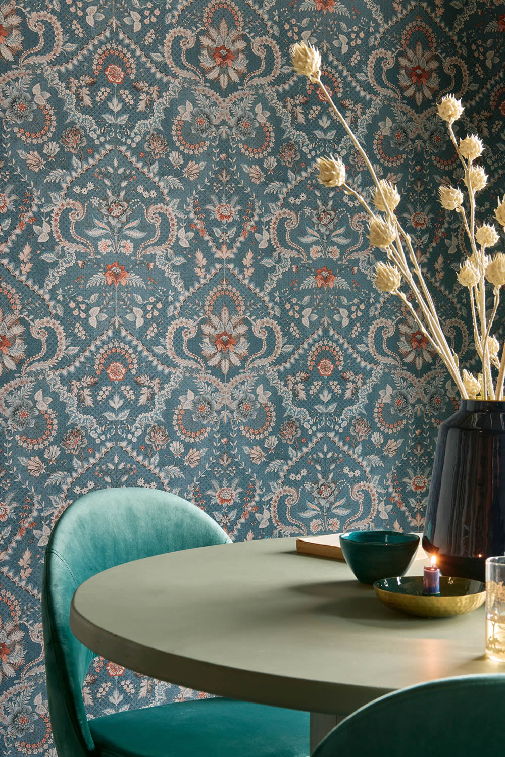 Diese Vliestapete im Vintage-Ornamentstil bringt eine harmonische Mischung aus floralen Mustern und zarten Ranken in mehrfarbigen Tönen auf einem beruhigenden blauen Hintergrund in den Raum. Das Design verleiht jedem Zimmer eine warme und natürliche Ausstrahlung und eignet sich besonders gut für Kinderzimmer, Mädchenzimmer und Teenager-Räume im Alter von 6 bis 18 Jahren. Die fein strukturierte, matte Oberfläche der Tapete hebt die filigranen Details der Blumen und Ranken besonders hervor und sorgt für eine elegante Wandgestaltung. Ihre praktischen Eigenschaften machen sie zu einer idealen Wahl für moderne Räume: Sie ist waschbeständig, lichtbeständig und schwer entflammbar, wodurch sie langlebig und pflegeleicht bleibt. Zudem ist die Tapete mit der Wandklebetechnik einfach anzubringen und lässt sich bei Bedarf trocken und restlos entfernen. Der versetzte Ansatz von 64 cm sorgt für ein harmonisches Gesamtbild an der Wand. Diese Tapete verbindet charmanten Vintage-Stil mit praktischen Vorteilen und bringt ein Stück Natur in das Zuhause.