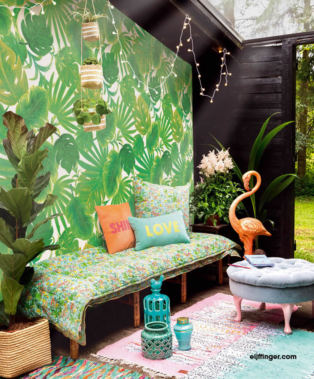 Grüne Palmenblätter schaffen auf einem rosa Hintergrund als Wandbild eine natürliche Optik im Kinderzimmer.