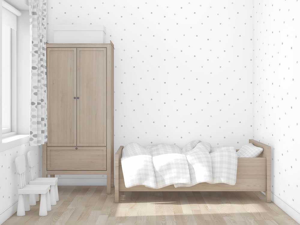 Streifen in weiß und grau schaffen eine schlichte und natürliche Atmosphäre im Kinderzimmer.