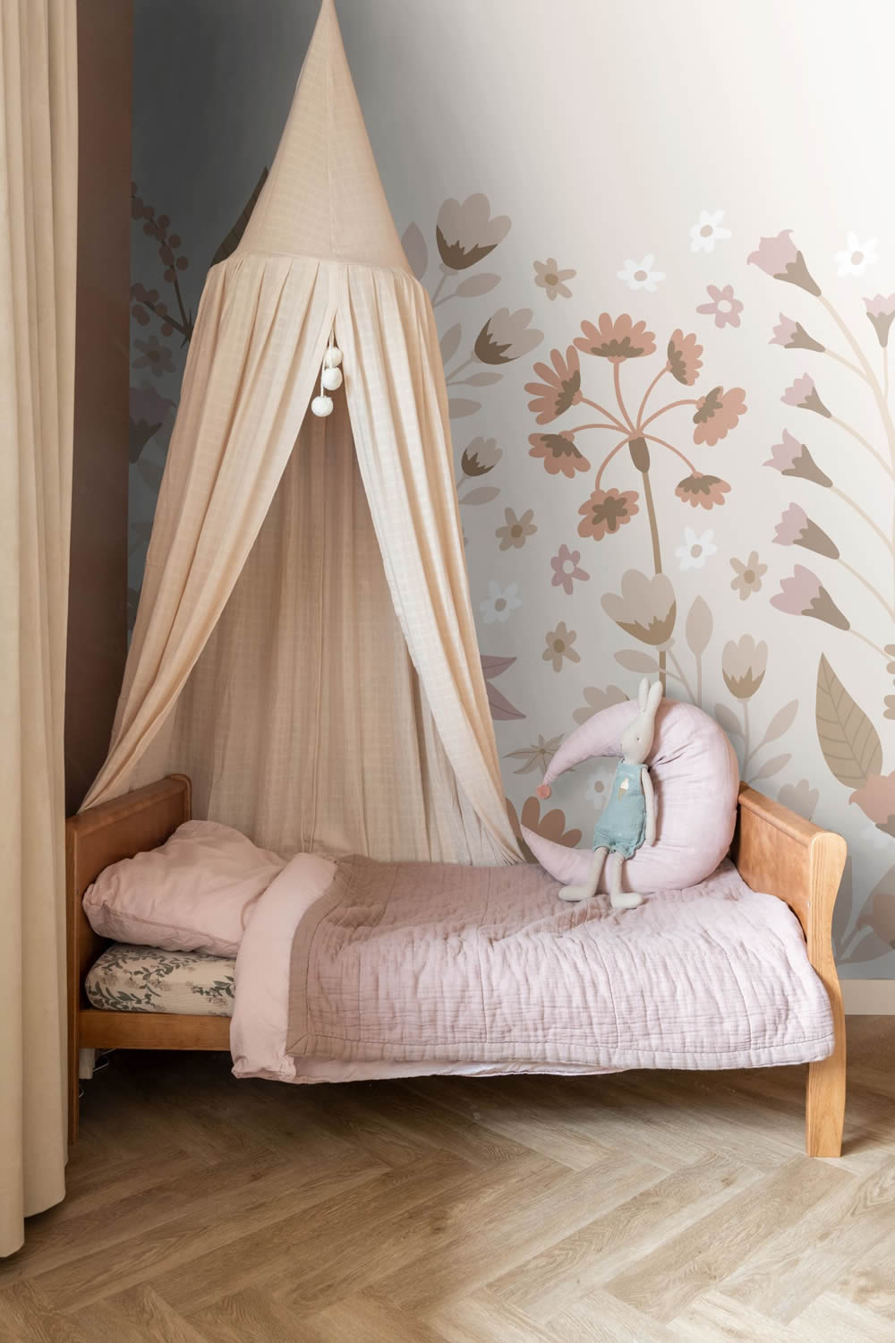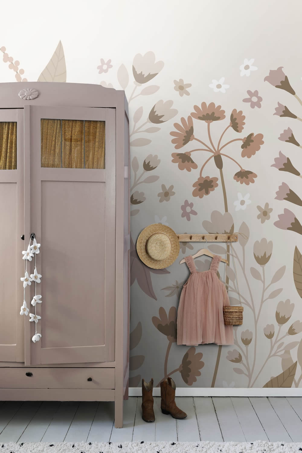 Dieses Wandbild auf Vliestapete ist eine liebevolle Gestaltungsidee für Mädchenzimmer im Alter von sechs bis achtzehn Jahren und kombiniert ein feines florales Muster mit einer Farbpalette in Beige, Creme und natürlichen Erdtönen. Die Blumenmotive sind leicht stilisiert und gleichmäßig über die Fläche verteilt, wodurch eine ruhige, aber dennoch lebendige Raumwirkung entsteht. Besonders für Mädchen, die sich eine warme, natürliche Umgebung wünschen, bietet dieses Design eine ideale Grundlage. Die matte Oberfläche sorgt dafür, dass das Motiv ohne störende Lichtreflexe erscheint, während die glatte Struktur die grafischen Details klar zur Geltung bringt. Mit einer Größe von 2,00 x 2,79 Metern ist das Wandbild ideal für mittlere Wandflächen geeignet und kann gezielt als stilvoller Blickfang im Schlafbereich, in der Leseecke oder an einer ruhigen Rückzugswand eingesetzt werden. Die natürlichen Farben lassen sich wunderbar mit hellen Möbeln, Holztönen oder Textilien in Pastell kombinieren und unterstreichen ein wohnliches, zeitgemäßes Raumgefühl. Auch funktional überzeugt die Tapete mit alltagstauglichen Eigenschaften: Sie ist waschbeständig und kann bei leichten Verschmutzungen einfach gereinigt werden. Die gute Lichtbeständigkeit sorgt dafür, dass die Farbtöne auch bei längerer Sonneneinstrahlung nicht an Leuchtkraft verlieren. Dank Wandklebetechnik lässt sich das Wandbild unkompliziert anbringen, indem der Kleister direkt auf die Wand aufgetragen wird. Die Bahnen lassen sich sauber ausrichten und bei Bedarf trocken und rückstandslos wieder abziehen. Dieses Design richtet sich an Mädchen im Schul- und Teenageralter, die ihr Zimmer stilvoll, natürlich und zugleich individuell gestalten möchten – mit einer floralen Optik, die Ruhe ausstrahlt und Raum für Persönlichkeit lässt.