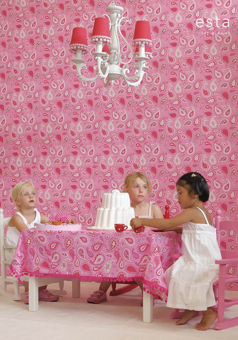 Für eine zauberhafte Atmosphäre im Kinderzimmer sorgt der rosafarbene Stoff mit beeindruckenden Mustern, welcher Mädchenherzen höher schlagen lässt.