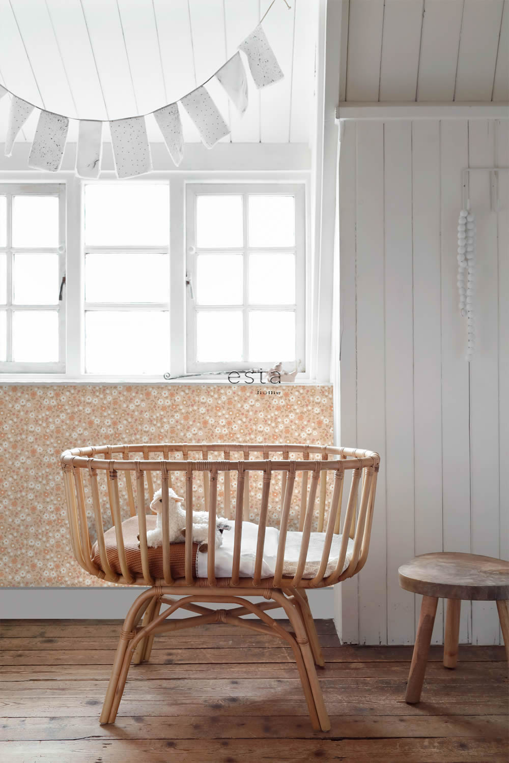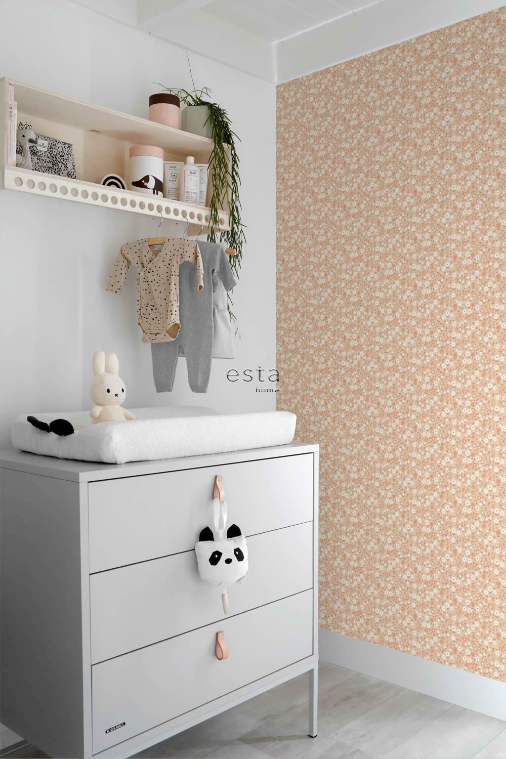 Mit der Blümchen Vliestapete von Esta Home zieht ein fröhliches und zugleich sanftes Blumenmuster ins Haus, das perfekt für Babyzimmer, Kinderzimmer oder Spielräume geeignet ist. Auf einem dezenten Hintergrund in Creme und Beige verteilen sich kleine Blüten in Apricot, Orange und Weiß, die wie ein blühender Garten wirken. Die feinen Details der Blumen schaffen ein lebendiges Bild, das zugleich harmonisch und beruhigend wirkt. So entsteht eine Atmosphäre, die Wärme, Geborgenheit und Verspieltheit ausstrahlt und sich ideal für Räume eignet, in denen Kinder aufwachsen, spielen und träumen. Das Muster wirkt freundlich und belebend, ohne den Raum zu überladen, wodurch es sich sowohl für großflächige Wände als auch für Akzentflächen eignet. Mit einer Rollenbreite von 0,53 Metern und einer Länge von 10,05 Metern bietet die Tapete flexible Gestaltungsmöglichkeiten. Der versetzte Ansatz von 8,8 Zentimetern sorgt dafür, dass das Muster gleichmäßig und harmonisch wirkt. Die Oberfläche ist glatt und matt, was den zarten Charakter der Tapete noch unterstreicht und für ein angenehmes Raumgefühl sorgt. Dank der modernen Wandklebetechnik ist das Anbringen unkompliziert, da der Kleister direkt auf die Wand aufgetragen wird. Auch im Alltag überzeugt die Tapete durch ihre praktischen Eigenschaften. Sie ist waschbeständig und damit leicht zu reinigen, was sie gerade für Kinderzimmer besonders geeignet macht. Zudem ist sie gut lichtbeständig, sodass die frischen Farben auch bei Sonnenlicht ihre Leuchtkraft behalten. Sollte eine Umgestaltung gewünscht sein, lässt sich die Vliestapete trocken und restlos von der Wand abziehen, ohne Rückstände zu hinterlassen. Mit diesem Design gelingt eine fröhliche und dennoch sanfte Wandgestaltung, die den Raum optisch vergrößert und mit Leichtigkeit erfüllt.