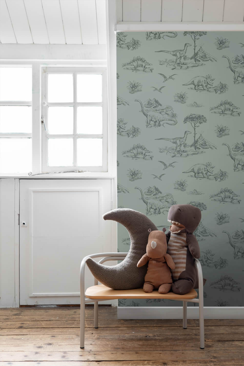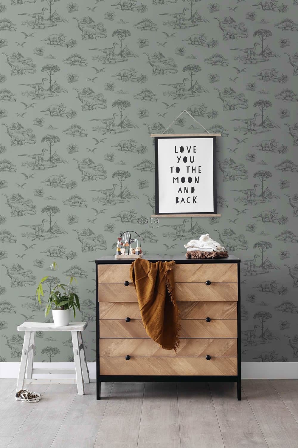 Mit dieser Tapete entsteht im Kinderzimmer eine lebendige Jurassic-Welt, in der Dinosaurier durch Landschaften voller Vulkane und Urzeitpflanzen streifen. Die detaillierten Zeichnungen zeigen verschiedene Dinos wie Brachiosaurus, Stegosaurus oder Triceratops, ergänzt durch liebevoll gestaltete Bäume und Felsen. Das grüne Farbkonzept schafft eine natürliche Atmosphäre, die gleichzeitig spannend und beruhigend wirkt. Kinder können in diese Szenerie eintauchen, Geschichten erfinden und ihre Fantasie in einer Welt voller Abenteuer entfalten. Die Tapete ist vielseitig einsetzbar und passt sowohl in Baby- und Kinderzimmer als auch in Spielbereiche. Möbel aus Holz oder schlichte weiße Einrichtungselemente harmonieren besonders gut mit dem naturbetonten Design und lassen die Illustrationen elegant wirken. Mit einer Rollenbreite von 0,53 Metern und einer Länge von 10,05 Metern bietet die Vliestapete genügend Material für Akzentflächen oder die Gestaltung kompletter Wände. Der versetzte Ansatz von 26,5 Zentimetern sorgt für einen stimmigen Gesamteindruck. Neben der ansprechenden Optik überzeugt die Tapete durch praktische Eigenschaften: Sie ist waschbeständig und damit leicht zu reinigen, außerdem gut lichtbeständig, sodass die Farben lange erhalten bleiben. Dank der Wandklebetechnik lässt sich die Tapete schnell und sauber anbringen, da der Kleister direkt auf die Wand aufgetragen wird. Wird später eine neue Raumgestaltung gewünscht, kann die Tapete trocken und rückstandslos abgezogen werden. Mit ihrem abenteuerlichen Dinosaurier-Motiv bietet sie Kindern eine fantasievolle Umgebung und Eltern eine stilvolle, pflegeleichte Lösung für die Wandgestaltung.
