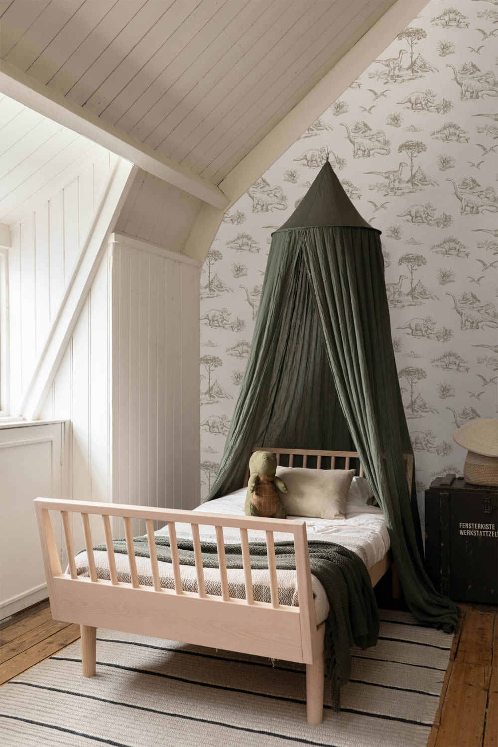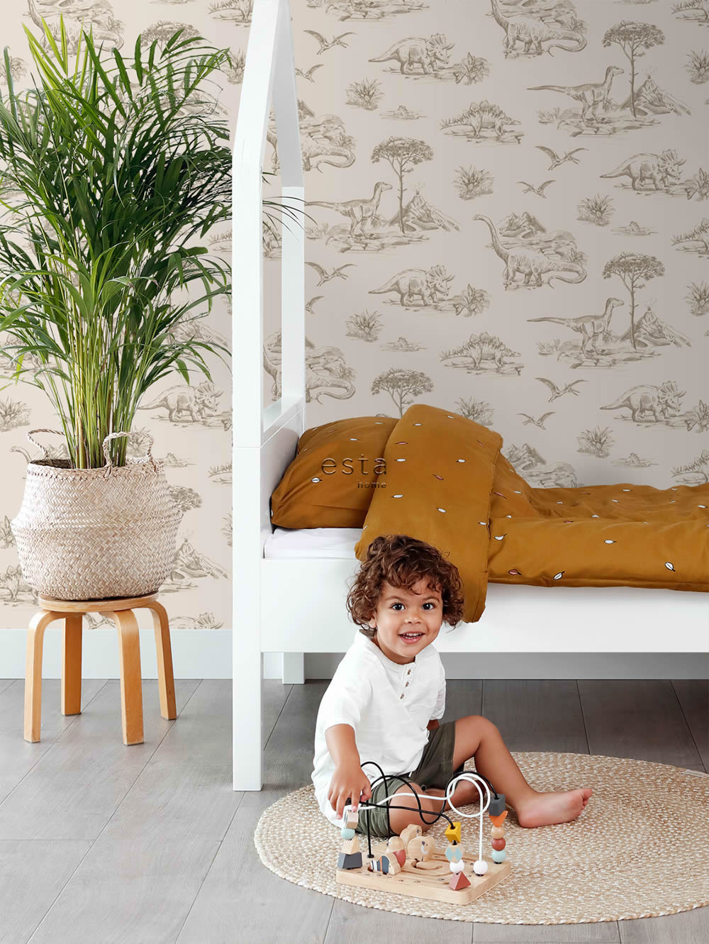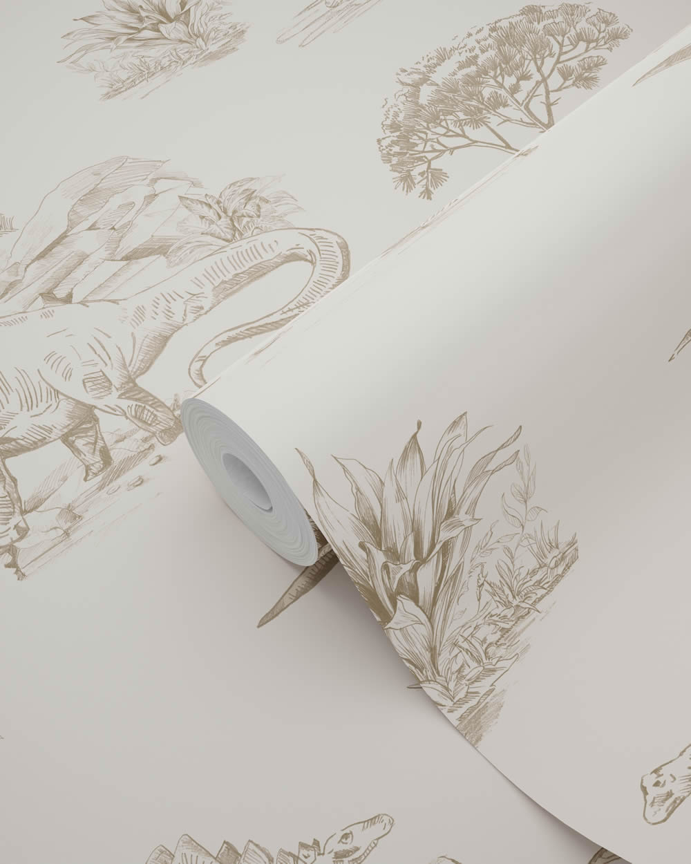 Mit dieser Tapete verwandelt sich das Kinderzimmer in eine aufregende Urzeitlandschaft, in der Dinosaurier durch Vulkane und Pflanzenwelten streifen. Die feinen Zeichnungen zeigen verschiedene Arten wie Brachiosaurus, Stegosaurus oder Triceratops und erinnern in ihrer Darstellungsweise an alte Abenteuergeschichten. Das beige Farbkonzept wirkt sanft und unaufdringlich, wodurch die Illustrationen besonders gut zur Geltung kommen und gleichzeitig eine ruhige Raumwirkung entsteht. Diese Kombination macht die Tapete sowohl für Kleinkinder als auch für Schulkinder interessant, da sie Fantasie anregt und Abenteuerlust weckt. In Kombination mit hellen Möbeln oder natürlichen Materialien entfaltet das Design seinen vollen Charme und lässt Räume größer und heller wirken. Die glatte matte Oberfläche sorgt für einen edlen Gesamteindruck, der sich harmonisch in verschiedene Einrichtungsstile einfügt. Mit den Maßen 0,53 mal 10,05 Meter pro Rolle und einem versetzten Ansatz von 26,5 Zentimetern eignet sich die Tapete für großflächige Wandgestaltungen ebenso wie für Akzentbereiche. Auch die praktischen Eigenschaften machen sie zu einer idealen Wahl für Kinderzimmer: Sie ist waschbeständig, sodass kleine Verschmutzungen mühelos entfernt werden können, und gut lichtbeständig, sodass die Farben lange frisch bleiben. Dank der Wandklebetechnik gelingt das Tapezieren schnell und sauber, da der Kleister direkt auf die Wand aufgetragen wird. Wird später eine neue Gestaltung gewünscht, lässt sich die Tapete trocken und rückstandslos abziehen. So bietet diese Dinosaurier Tapete nicht nur ein spannendes Motiv für Kinder, sondern auch eine langlebige, pflegeleichte Lösung für Eltern.