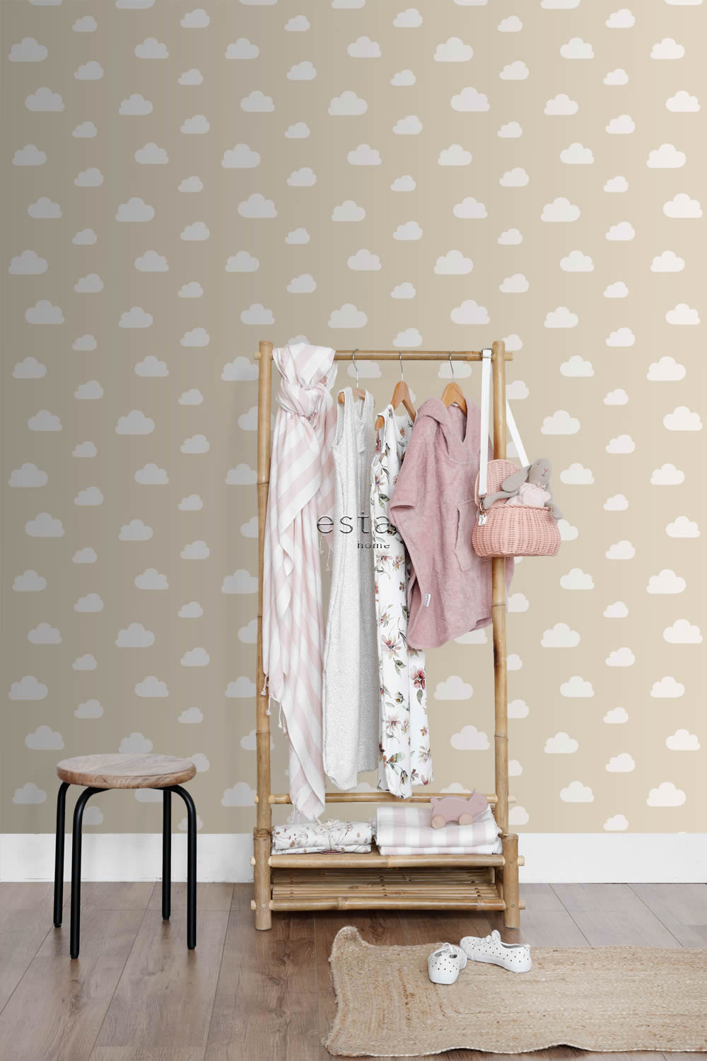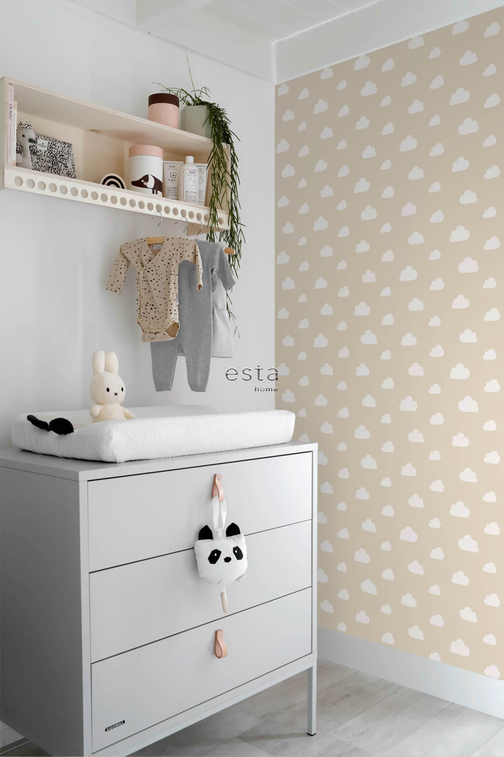 Diese liebevoll gestaltete Vliestapete bringt eine ruhige, natürliche Stimmung ins Kinderzimmer und vereint dabei modernes skandinavisches Design mit der Leichtigkeit von schwebenden Wolken. Die wolkenförmigen Motive sind in einem weichen Cremeweiß gehalten und heben sich sanft vom beigen Hintergrund ab, der in einem angenehmen Sandton gestaltet ist. Das Muster wirkt gleichmäßig, ohne aufdringlich zu sein, und vermittelt ein Gefühl von Leichtigkeit und Geborgenheit. Besonders für Babyzimmer und Schlafbereiche von Kleinkindern ist diese Tapete eine wunderbare Wahl, denn sie schafft eine beruhigende Umgebung, die zum Ausruhen und Träumen einlädt. Durch den reduzierten Stil lässt sich das Design hervorragend mit natürlichen Materialien wie Holz, Rattan oder Leinen kombinieren. Möbel in Weiß oder hellem Grau sowie Accessoires in Pastellfarben unterstreichen die zurückhaltende Wirkung des Motivs und lassen den Raum gleichzeitig freundlich und modern wirken. Auch im Boho-Stil eingerichtete Kinderzimmer profitieren von dem luftigen Muster, das Struktur bietet, ohne den Raum zu überladen. Die Oberfläche ist glatt und matt, wodurch Licht sanft reflektiert wird, ohne störenden Glanz zu erzeugen. Das sorgt für ein angenehmes Raumgefühl zu jeder Tageszeit. Die Tapete hat einen versetzten Ansatz von 26,5 Zentimetern, der das Motiv lebendig macht, ohne Unruhe zu erzeugen. Mit einer Rollenbreite von 0,53 Metern und einer Länge von 10,05 Metern bietet sie ausreichend Material für ganze Wände oder auch gezielte Akzentflächen hinter dem Bettchen oder der Wickelkommode. Die hochwertige Vliesqualität macht das Anbringen besonders einfach, denn sie wird direkt auf die eingekleisterte Wand aufgebracht. Bei Bedarf lässt sie sich später trocken und vollständig abziehen, ohne Rückstände zu hinterlassen. Darüber hinaus ist sie waschbeständig und gut lichtbeständig, was sie auch im Alltag zu einer praktischen Lösung für Familien mit kleinen Kindern macht. Hergestellt wird die Tapete vom renommierten Hersteller Esta Home und gehört zur liebevoll kuratierten Kollektion To The Moon And Back. Diese verbindet modernes Design mit kindgerechter Wärme und ist ideal für alle, die eine stilvolle und zugleich behagliche Gestaltung im Kinderzimmer wünschen.