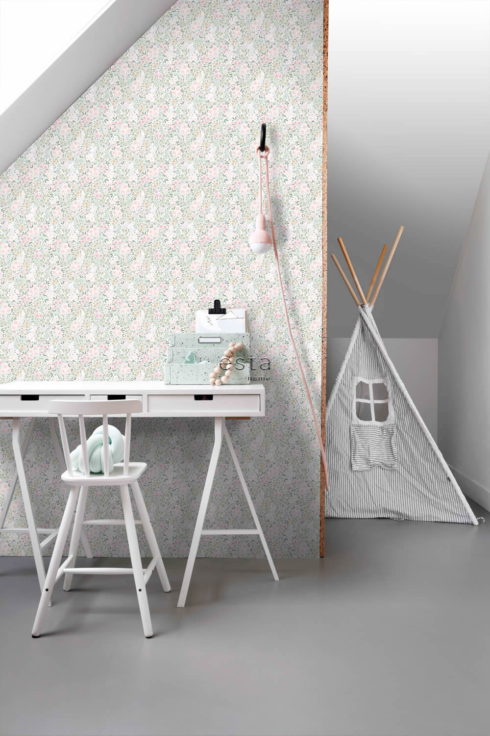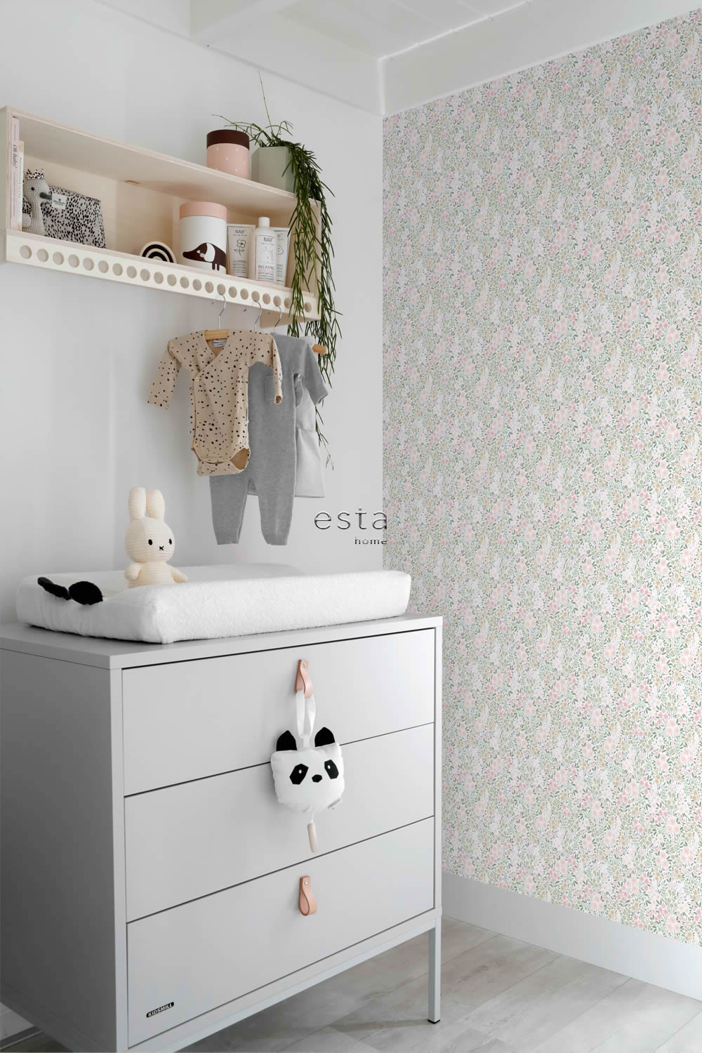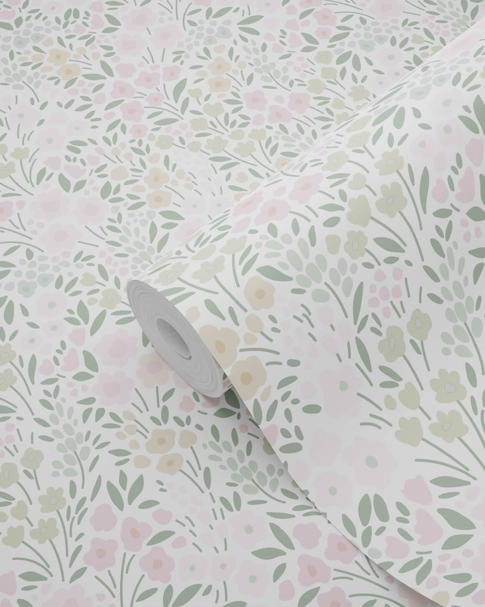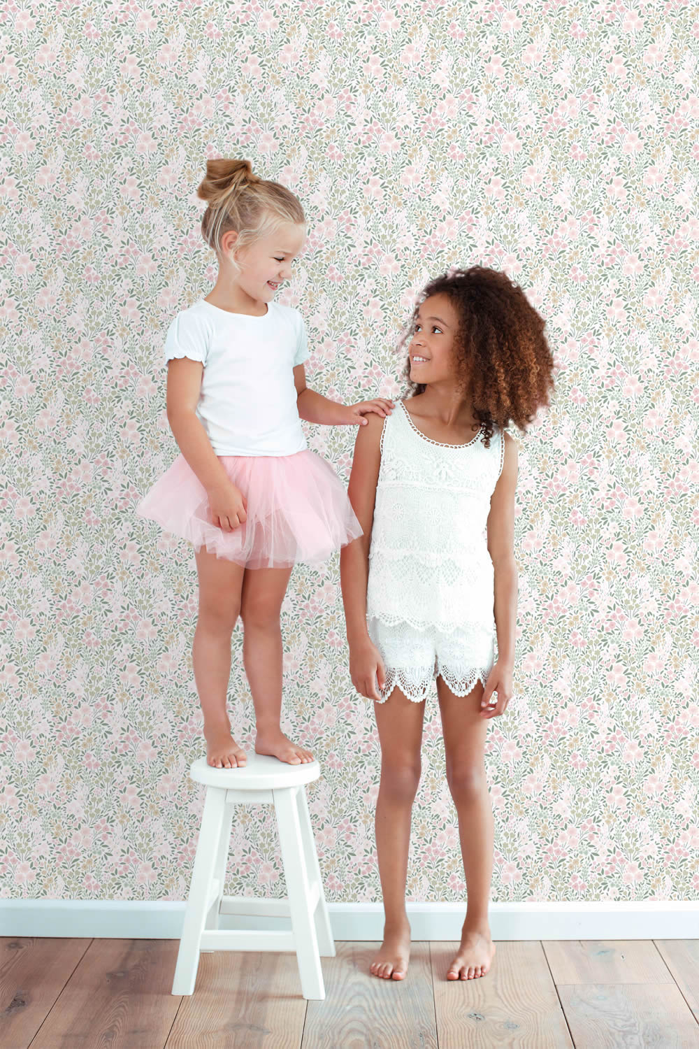 Ein zartes Blütenmeer in Rosa, Beige und hellem Grün schmückt diese liebevoll gestaltete Vliestapete und verleiht dem Raum eine ruhige und freundliche Atmosphäre. Das florale Muster wirkt verspielt und natürlich zugleich und eignet sich perfekt für Babyzimmer oder stilvoll eingerichtete Mädchenzimmer. Die glatte matte Oberfläche rundet das Gesamtbild ab. Waschbeständig, gut lichtbeständig, einfach mit Wandklebetechnik anzubringen und trocken restlos abziehbar.