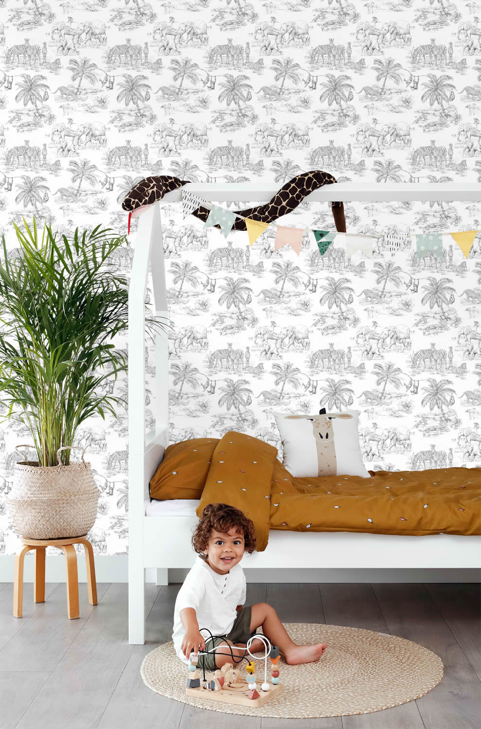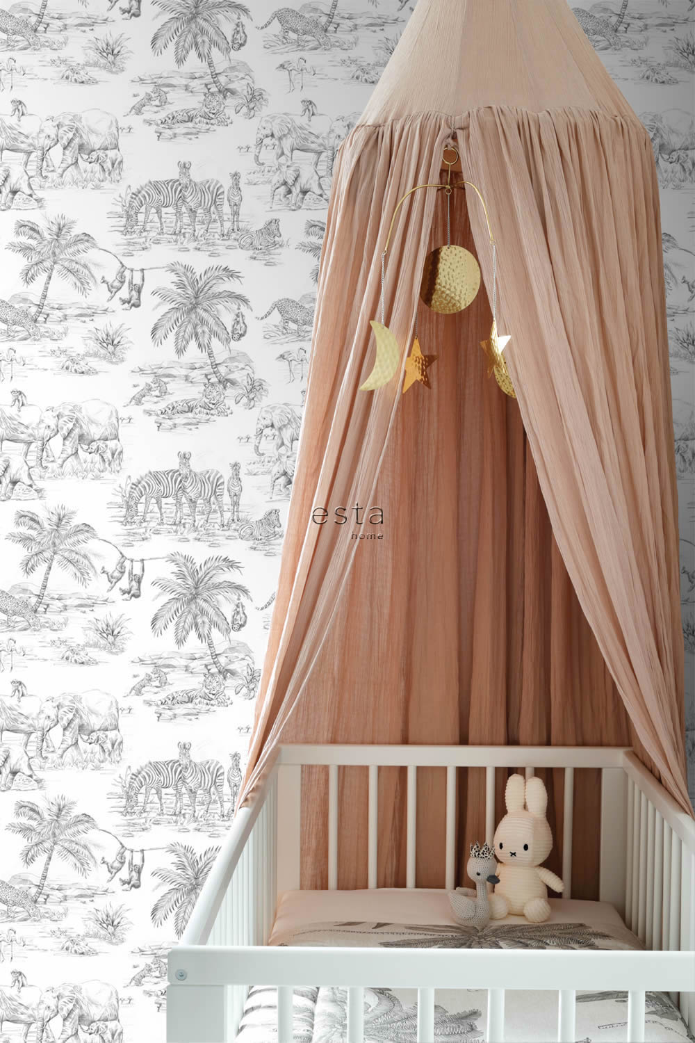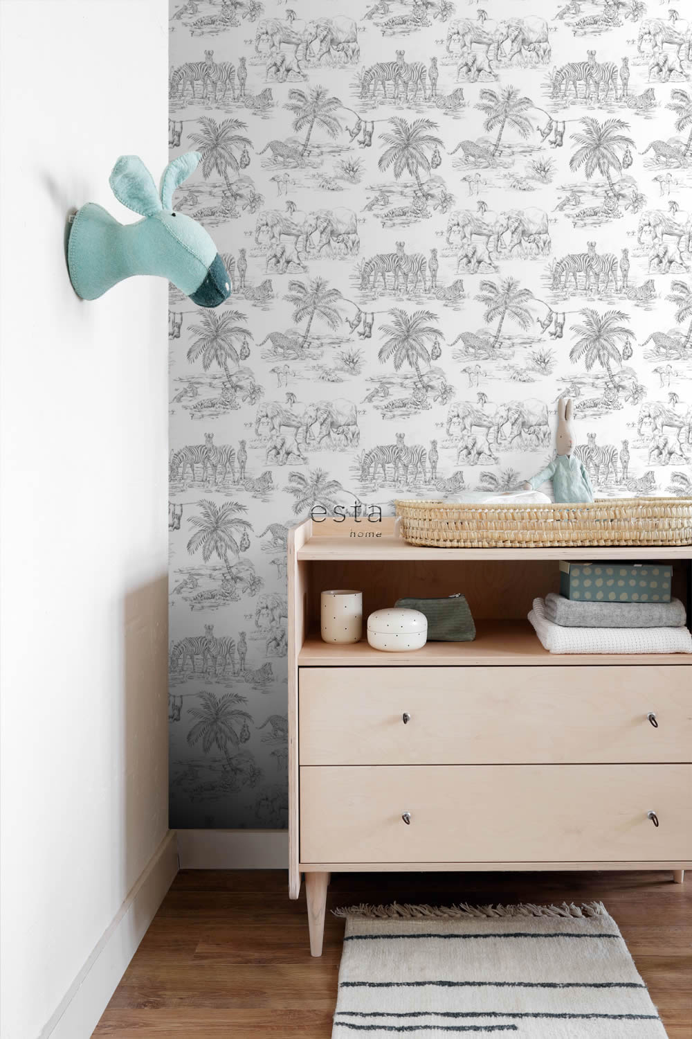 Diese Vliestapete verwandelt das Kinderzimmer in eine abenteuerliche Safari Landschaft, in der detailreiche Tierzeichnungen in Schwarz Weiß eine besondere Stimmung erzeugen. Gezeigt werden Zebras, Affen, Elefanten, Tiger, Flamingos, Leoparden und viele weitere Tiere, die sich zwischen Felsen, Wasserstellen und Palmen bewegen. Die Szenen sind im Stil klassischer Naturillustrationen gehalten und wirken damit besonders edel und zeitlos. Durch die schwarz weiße Gestaltung lässt sich die Tapete wunderbar mit natürlichen Farben, Holz und hellen Textilien kombinieren, was eine harmonische Raumwirkung fördert. Sie eignet sich ideal für Kinder ab zwei Jahren und bleibt durch ihre ruhige Gestaltung auch für ältere Kinder interessant. Die Tierwelt wird realistisch, aber freundlich dargestellt und regt die Fantasie kleiner Entdecker an. Ob an einer Akzentwand oder im ganzen Raum eingesetzt, entsteht eine faszinierende Safari Kulisse. Die Tapete besitzt einen geraden Ansatz von 53 Zentimetern, wodurch die Motive gleichmäßig angeordnet sind und ein ruhiges Gesamtbild entsteht. Die matte, glatte Oberfläche vermeidet Lichtreflexe und bringt die feinen Zeichnungen besonders gut zur Geltung. Mit einer Rolle lassen sich 0,53 mal 10,05 Meter Wandfläche gestalten. Dank Wandklebetechnik ist das Anbringen einfach und sauber. Die Tapete ist waschbeständig, gut lichtbeständig und trocken restlos abziehbar, was sie besonders pflegeleicht macht. Hergestellt von Esta Home und Teil der Kollektion To the Moon and Back, steht sie für Qualität und kindgerechtes Design mit Stil.
