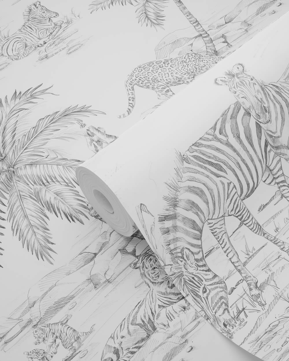 Diese liebevoll gestaltete Dschungel Vliestapete zeigt Zebras, Elefanten, Affen und weitere Tiere Afrikas in schwarz weißer Zeichnung. Umgeben von Palmen und Wasserstellen entsteht ein spannendes Safari Motiv, das Kindern eine fantasievolle Welt zum Entdecken bietet. Die matte, glatte Oberfläche wirkt edel und ruhig. Waschbeständig, gut lichtbeständig und trocken restlos abziehbar.
