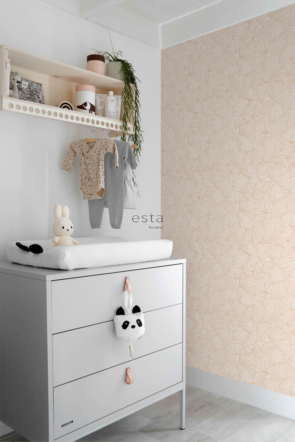 Diese Vliestapete mit feinem Ginkgo Blättermotiv in Beige und Terrakotta vereint Natürlichkeit mit stilvoller Eleganz und bringt eine harmonische Ausstrahlung ins Kinderzimmer. Die großen, fächerförmigen Blätter sind dicht aneinandergereiht und zeigen eine dezente Linienzeichnung, die an handgezeichnete Illustrationen erinnert. Durch den warmen Beigeton mit leichtem Terrakotta Einschlag entsteht ein sanftes Farbspiel, das sich perfekt mit Holzmöbeln, weißen Elementen oder pastelligen Akzenten kombinieren lässt. Das Muster wirkt zugleich beruhigend und dekorativ, wodurch die Tapete sowohl für die Kleinsten als auch für ältere Kinder und Jugendliche geeignet ist. Ob als komplette Wandgestaltung oder als dezenter Akzent im Raum, dieses Design bringt ein Stück Natur und Entspannung in den Alltag. Die matte, glatte Oberfläche reflektiert kein Licht und unterstreicht die weiche Anmutung des Musters. Mit einer Rollenbreite von 0,53 Metern und einer Länge von 10,05 Metern lassen sich verschiedene Wandflächen flexibel gestalten. Der gerade Ansatz von 53 Zentimetern sorgt dabei für ein regelmäßiges und ruhiges Erscheinungsbild. Die hochwertige Vliestapete ist waschbeständig, gut lichtbeständig, trocken restlos abziehbar und lässt sich mit der Wandklebetechnik schnell und sauber anbringen. Sie stammt aus der Kollektion To the Moon and Back von Esta Home und überzeugt durch ihr natürliches Design und ihre kinderfreundliche Qualität.