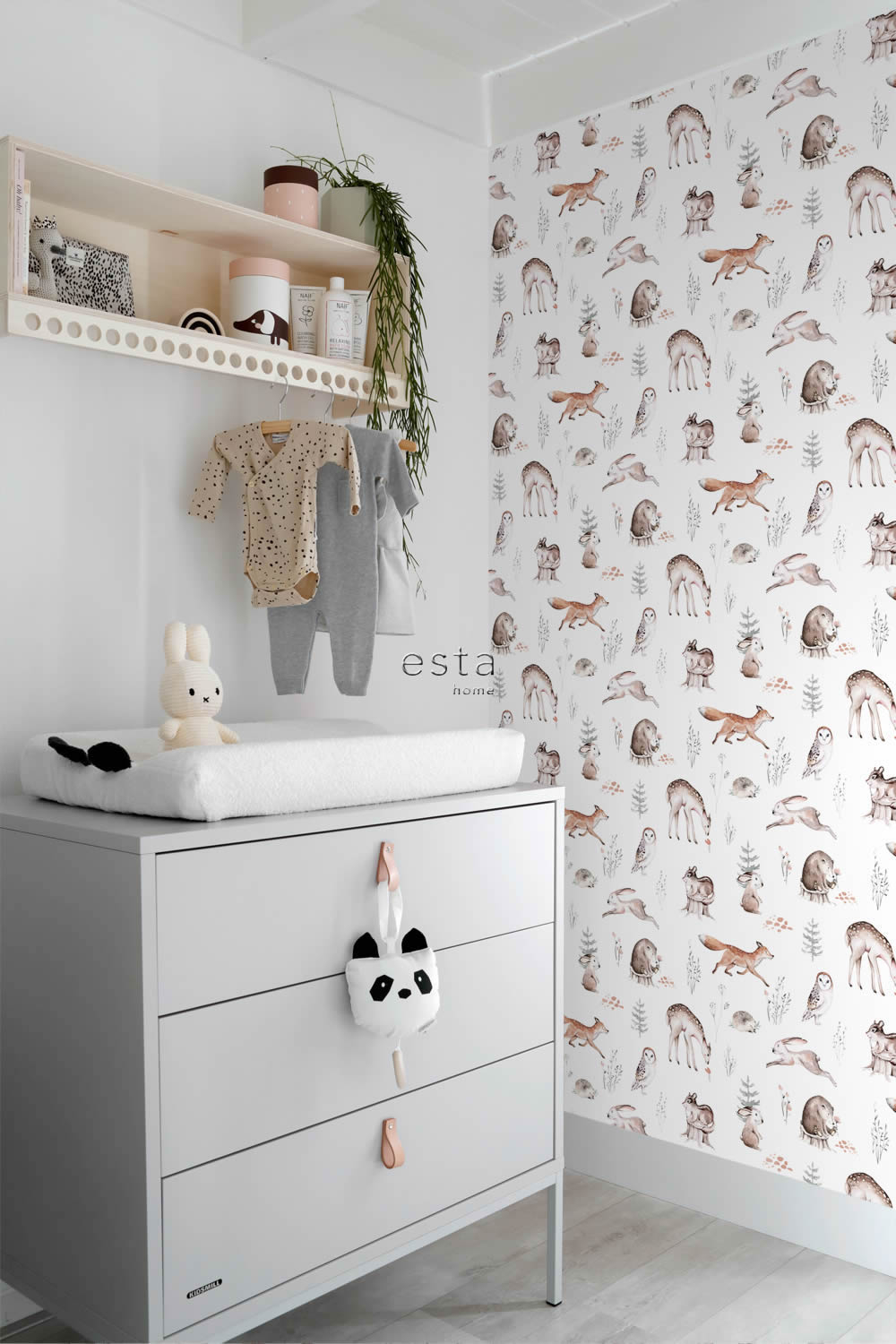Diese Vliestapete mit Waldtieren im zarten Aquarellstil bringt die friedliche Schönheit der Natur auf besonders liebevolle Weise in das Kinderzimmer und schafft eine warme, behagliche Atmosphäre, in der Kinder träumen, spielen und zur Ruhe kommen können. Auf einem klar weißen Hintergrund sind fein illustrierte Tiere wie Füchse, Rehe, Hasen, Igel, Eulen und kleine Vögel dargestellt, die sich zwischen filigranen Gräsern, Blumen und Zweigen bewegen. Die Motive wirken durch ihre Aquarellzeichnung weich und natürlich, wodurch sie sich harmonisch in den Raum einfügen und eine beruhigende Wirkung entfalten. Die sanften Farbnuancen in Beige, Rosé, Braun und Grau verleihen der Tapete eine elegante Leichtigkeit, die sowohl für Mädchen- als auch für Jungenzimmer ideal ist. Besonders im Babyzimmer sorgt dieses Design für Geborgenheit und Wärme, während es im Kinderzimmer zu fantasievollen Spielen und Geschichten anregt. Kinder können die Tiere auf der Tapete entdecken, ihnen Namen geben und kleine Abenteuer im Kopf erleben, was die Gestaltung zu einem aktiven Bestandteil der Raumwelt macht. Die Kombination aus kindgerechter Gestaltung und stilvollem Naturdesign spricht auch Eltern an, die Wert auf eine ruhige, zeitlose und moderne Einrichtung legen. Die matte, glatte Oberfläche sorgt für ein hochwertiges Erscheinungsbild, das an handgemalte Illustrationen erinnert. Sie fühlt sich angenehm an und reflektiert das Licht dezent, was den Raum heller und freundlicher wirken lässt. Praktisch ist die Tapete ebenfalls, denn sie ist waschbeständig und lichtbeständig, sodass sie auch den Anforderungen eines Kinderzimmers standhält. Kleine Verschmutzungen können problemlos entfernt werden, und die Farben bleiben lange frisch und klar, selbst bei täglichem Sonnenlicht. Die Anbringung erfolgt mit der Wandklebetechnik, die ein einfaches und sauberes Verarbeiten ermöglicht, ohne dass die Bahnen eingeweicht werden müssen. So können auch Eltern ohne Tapeziererfahrung die Tapete problemlos anbringen. Der versetzte Ansatz von 26,5 Zentimetern sorgt für ein lebendiges und natürliches Gesamtbild, bei dem die Tiere und Pflanzen fließend ineinander übergehen. Sollte später eine Umgestaltung des Zimmers gewünscht sein, kann die Tapete trocken und restlos wieder abgezogen werden, ohne Spuren an der Wand zu hinterlassen. Die neutrale Farbgestaltung erlaubt eine Vielzahl an Kombinationen mit Möbeln und Dekorationen. Besonders gut passen Holzmöbel, weiße Textilien und Accessoires in Pastelltönen, aber auch Stoffe in warmen Naturfarben wie Creme oder Sand harmonieren wunderbar. Durch diese Vielseitigkeit ist die Tapete eine ideale Grundlage für Räume, die mit dem Kind mitwachsen können. Sie vereint Ästhetik, Funktionalität und Langlebigkeit und ist somit die perfekte Wahl für Eltern, die ein liebevolles, modernes und gleichzeitig praktisches Kinderzimmer gestalten möchten.