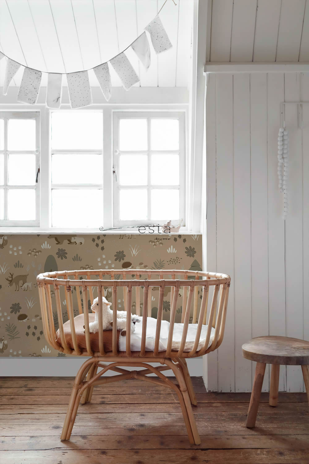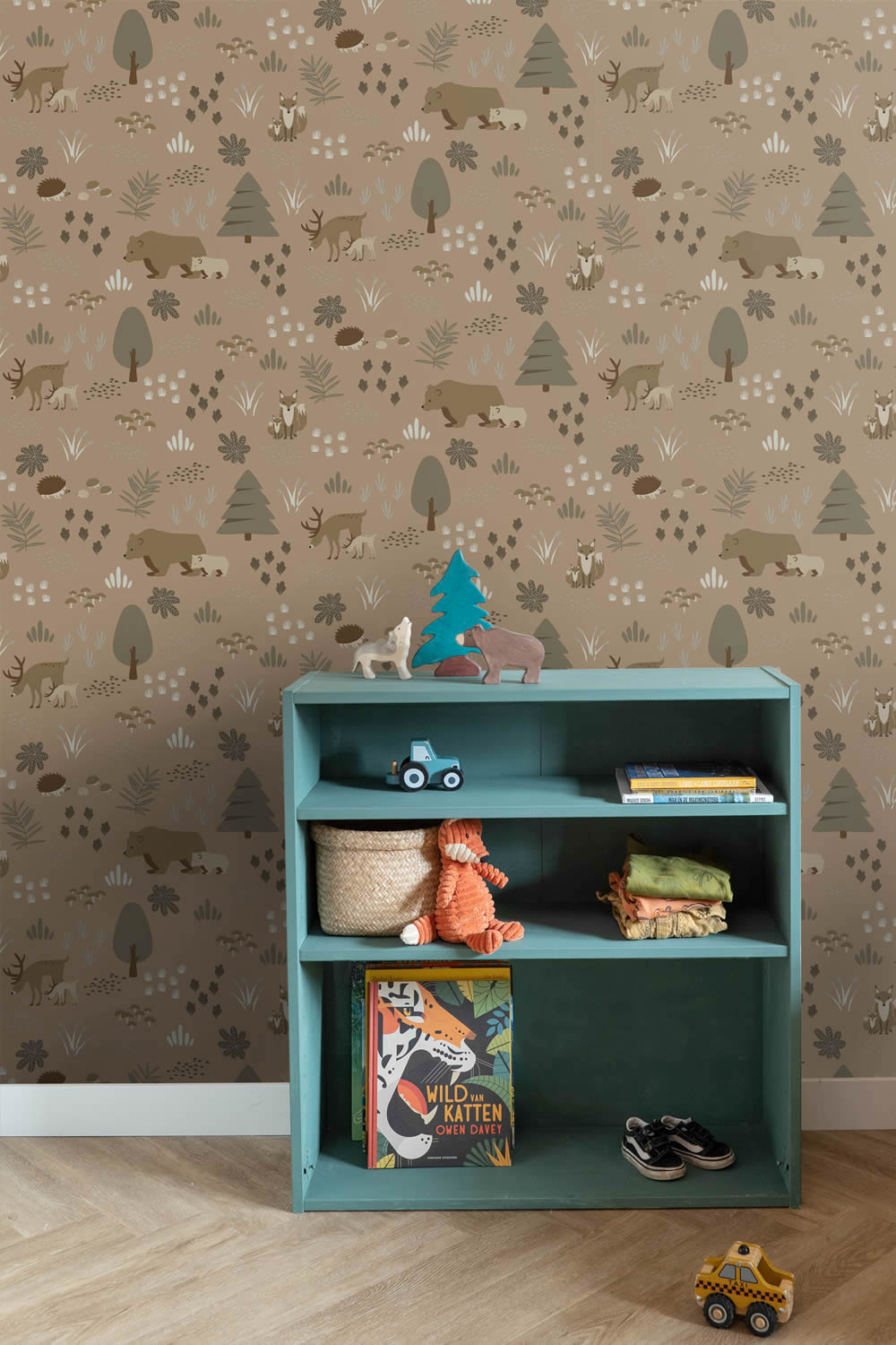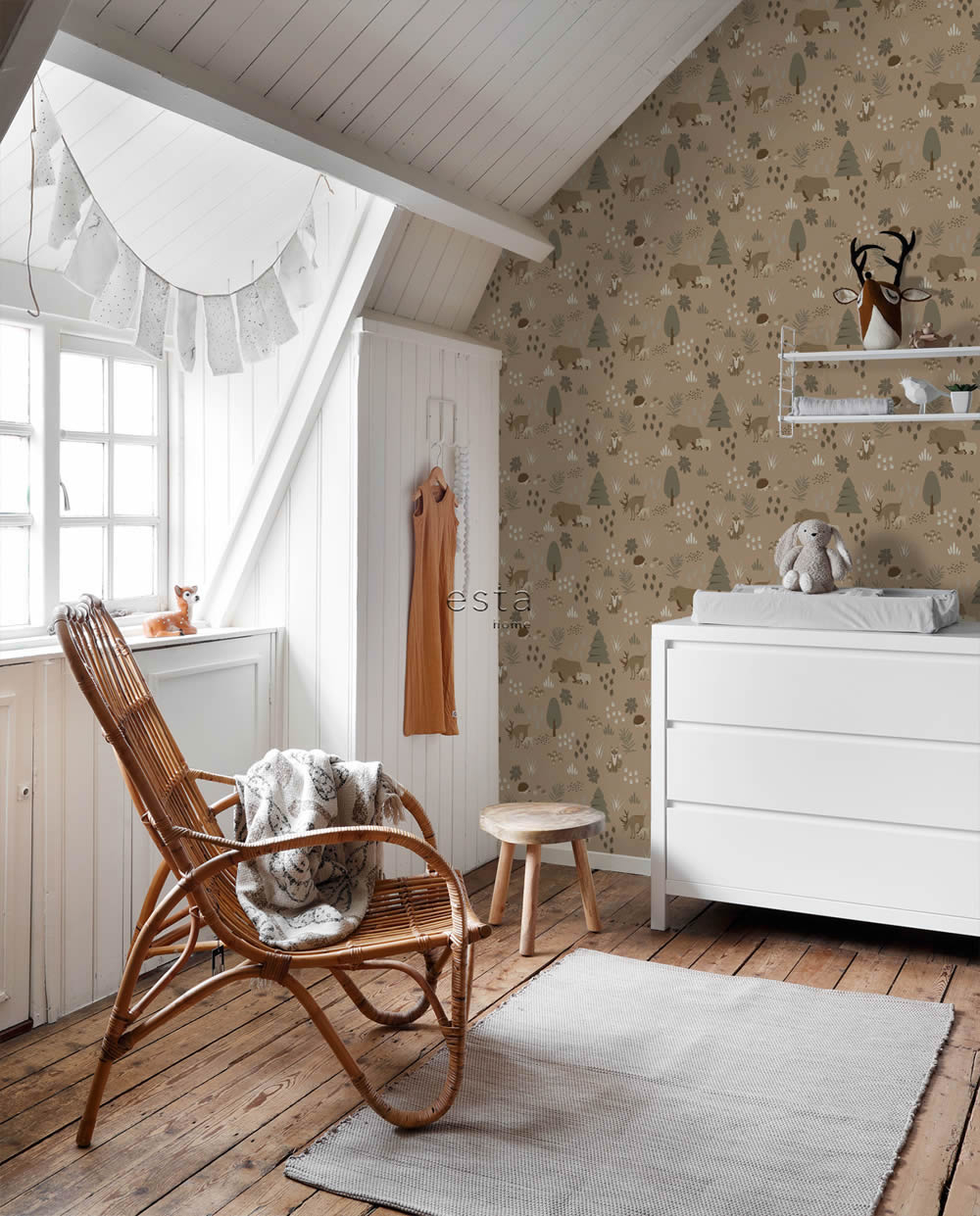 Diese Vliestapete mit liebevoll gestalteten Waldtieren und Bäumen im modernen skandinavischen Stil bringt die Ruhe und Geborgenheit der Natur direkt in das Kinderzimmer. Auf einem sanften braunen Hintergrund entfaltet sich eine harmonische Szenerie aus Bären, Rehen, Füchsen und Igeln, die inmitten von Bäumen, Pilzen und Gräsern dargestellt sind. Die warme erdige Farbgebung schafft ein Gefühl von Geborgenheit und Natürlichkeit, das besonders für Babyzimmer und Kleinkindräume ideal ist. Die Illustrationen sind kindgerecht und dennoch stilvoll, wodurch die Tapete sowohl verspielt als auch modern wirkt. Durch die schlichten Formen und klaren Linien entsteht eine angenehme Balance zwischen Natürlichkeit und Struktur, die perfekt zu skandinavischen Einrichtungskonzepten passt. Kinder können auf der Tapete kleine Geschichten entdecken, Tiere wiedererkennen und sich fantasievolle Abenteuer ausdenken, wodurch sie nicht nur dekorativ, sondern auch inspirierend wirkt. Die matte, glatte Oberfläche sorgt für eine hochwertige Haptik und verleiht dem Raum eine ruhige, sanfte Ausstrahlung. Gleichzeitig ist die Tapete praktisch und langlebig, denn sie ist waschbeständig und gut lichtbeständig. Dadurch bleibt die Farbintensität über lange Zeit erhalten, und kleine Verschmutzungen lassen sich problemlos entfernen. Dank Wandklebetechnik gelingt das Anbringen einfach und sauber, ohne dass die Tapetenbahnen eingeweicht werden müssen. Mit einem versetzten Ansatz von 26,5 Zentimetern entsteht ein gleichmäßiges und natürlich wirkendes Muster, das den Charakter der Tapete perfekt unterstreicht. Sollte sich später der Stil des Kinderzimmers ändern, lässt sich die Tapete trocken und restlos wieder abziehen, was die Renovierung besonders unkompliziert macht. Die dezente Gestaltung und die warmen Naturfarben lassen sich wunderbar mit Möbeln aus Holz, weißen Textilien oder Accessoires in Beige und Grün kombinieren. Dadurch entsteht ein harmonisches Gesamtbild, das sowohl Jungen als auch Mädchen anspricht. Diese Tapete ist ideal für Eltern, die einen modernen, kindgerechten und gleichzeitig zeitlosen Stil bevorzugen. Sie verwandelt das Kinderzimmer in eine liebevolle Waldlandschaft, die Ruhe und Geborgenheit vermittelt, ohne aufdringlich zu wirken. Die Kombination aus Design, Qualität und Funktionalität macht sie zu einer langlebigen Grundlage für Räume, in denen Kinder sich wohl, sicher und inspiriert fühlen.