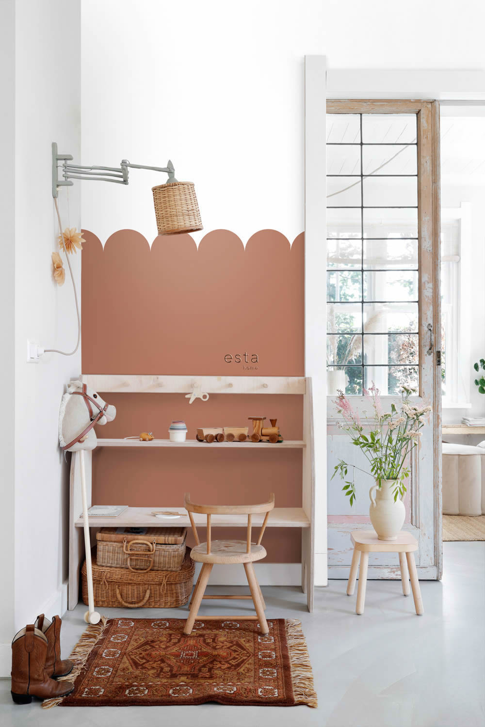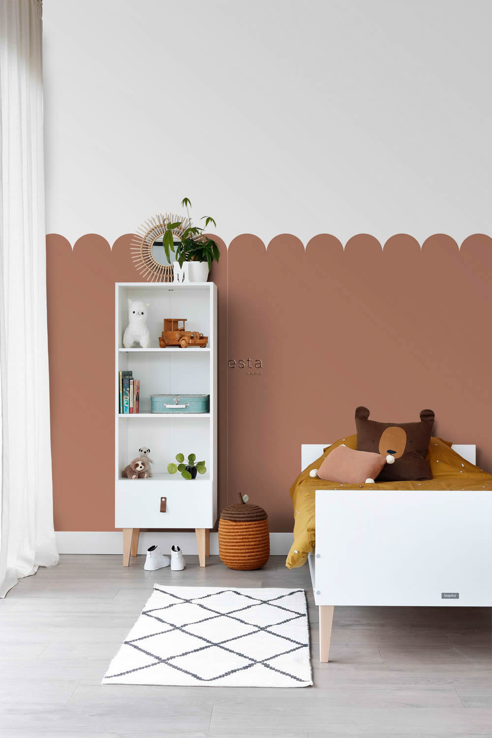 Dieses liebevoll gestaltete Wandbild bringt mit seinen sanften Bögen in Terracotta und Weiß ein modernes, stilvolles Element in jedes Kinderzimmer. Die gleichmäßigen Rundungen erzeugen ein ruhiges und harmonisches Gesamtbild, das Geborgenheit ausstrahlt und gleichzeitig Raum für Fantasie lässt. Besonders für Babyzimmer, Spielbereiche oder kreative Räume von Minis, Kids oder Teenies eignet sich dieses Design hervorragend, da es sowohl beruhigend als auch inspirierend wirkt. Die warme Terracotta-Farbe erinnert an erdige Naturtöne und sorgt für eine gemütliche Stimmung, während das klare Weiß Frische und Leichtigkeit vermittelt. Diese Farbkombination lässt sich wunderbar mit hellen Holzmöbeln, Textilien in Naturfarben oder farbigen Akzenten in Senfgelb, Altrosa oder Creme kombinieren. Das Muster ist einfach, aber wirkungsvoll. Die großen, runden Bögen laufen gleichmäßig über die zwei Bahnen und erzeugen ein harmonisches Wandbild, das sowohl hinter dem Bett, der Spielecke oder der Leseecke ein echtes Highlight darstellt. Durch die praktische Größe von 100 x 279 cm ist die Fototapete flexibel einsetzbar und passt an viele unterschiedliche Wandflächen, ohne dabei den Raum zu überladen. Neben dem Design überzeugt das Produkt durch seine durchdachten Eigenschaften. Die Fototapete ist waschbeständig und gut lichtbeständig, was sie besonders pflegeleicht macht. Sollte das Kinderzimmer umgestaltet werden, lässt sich die Tapete dank ihrer trockenen Abziehbarkeit rückstandslos entfernen. Die Wandklebetechnik ermöglicht eine einfache Anwendung, da der Kleister direkt auf die Wand aufgetragen wird. So gelingt die Anbringung schnell und sauber. Die Oberfläche der Tapete ist glatt und matt, was für eine elegante und moderne Wirkung sorgt, ohne zu glänzen oder zu überladen. Dieses Wandbild ist Teil der Kollektion To The Moon And Back des renommierten Herstellers Esta Home und steht für hochwertige Materialien, kinderfreundliches Design und praktische Funktionalität. Es eignet sich für viele Altersgruppen und bringt stilvolle Ruhe sowie spielerische Leichtigkeit in jeden Raum.