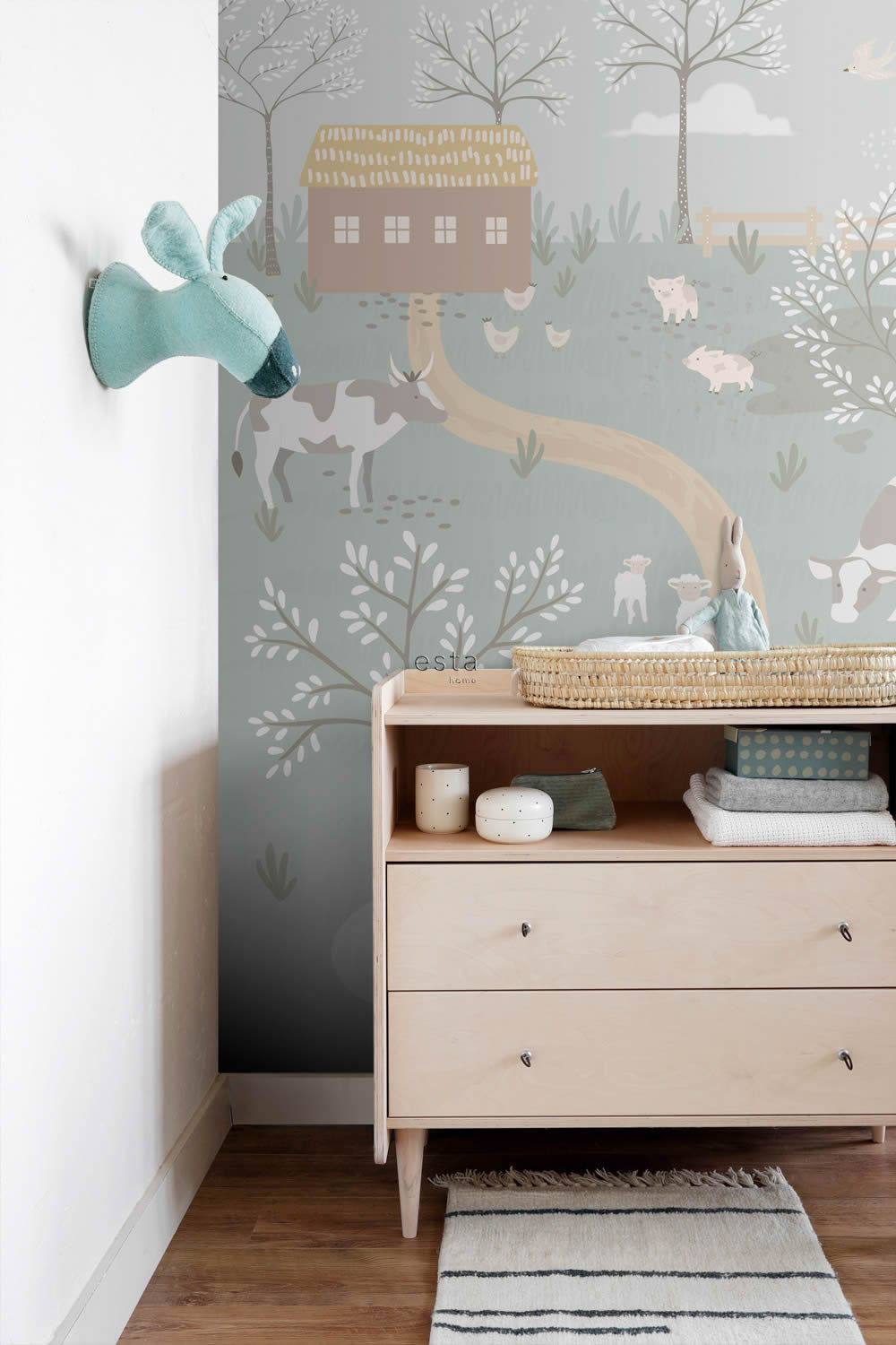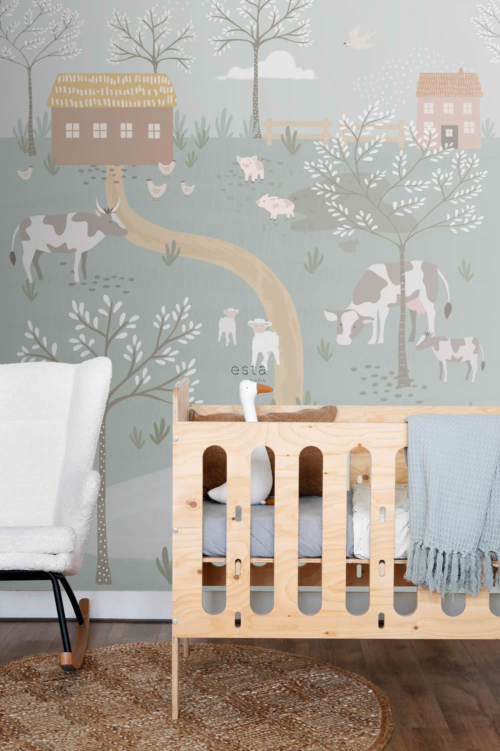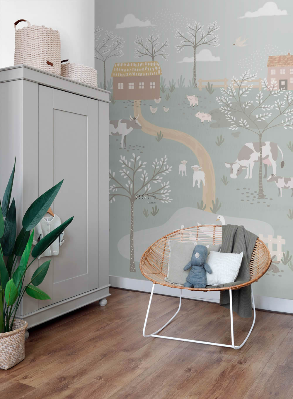 Mit diesem traumhaften Wandbild zieht das Leben auf dem Land direkt ins Kinderzimmer ein. Eine friedliche Bauernhofszene zeigt Kühe auf der Weide, verspielte Schweinchen, gackernde Hühner und eine Entenfamilie am Teich. Alles ist eingebettet in eine sanft grüne Landschaft mit stilisierten Bäumen, kleinen Häuschen und einem geschwungenen Weg, der die Motive miteinander verbindet. Die Farbgebung in dezenten Grüngrau-Nuancen wirkt beruhigend und freundlich zugleich. Sie schafft eine harmonische Atmosphäre, in der sich Kinder vom ersten Moment an wohlfühlen können. Das Design ist kindgerecht und mit viel Liebe zum Detail illustriert. Die Tiere sind freundlich dargestellt und laden zum Erzählen, Lernen und Fantasieren ein. Das Wandbild eignet sich besonders gut für Babyzimmer, Spielbereiche oder Schlafräume von Minis und kleinen Kindern. Es vermittelt eine Geschichte, ohne laut zu sein, und begleitet die Kleinen beim Spielen, Träumen und Großwerden. Die großzügigen Maße von 200 x 279 cm verteilen sich auf vier Bahnen, die gemeinsam eine durchgehende, ruhige Szenerie ergeben. Durch die matte, glatte Oberfläche wirkt die Tapete hochwertig und zurückhaltend zugleich. Sie lässt sich leicht in bestehende Einrichtungskonzepte integrieren, etwa mit Möbeln aus Naturholz, pastelligen Textilien oder Accessoires im Landhausstil. Auch funktional überzeugt die Fototapete mit praktischen Eigenschaften. Sie ist waschbeständig und gut lichtbeständig, was sie besonders pflegeleicht macht. Sollte ein Tapetenwechsel anstehen, kann sie trocken und rückstandslos entfernt werden. Die Wandklebetechnik ermöglicht eine einfache Anbringung, da der Kleister direkt auf die Wand aufgetragen wird. So gelingt die Montage schnell und unkompliziert. Das Wandbild stammt aus der beliebten Kollektion To The Moon And Back von Esta Home, einem Hersteller, der für hochwertige Kindertapeten mit liebevollem Design steht. Dieses Bauernhof-Motiv bringt kindliche Freude, ländliche Ruhe und einen Hauch Nostalgie ins Zimmer und schafft eine Umgebung, in der kleine Tierfreunde sich rundum geborgen fühlen.