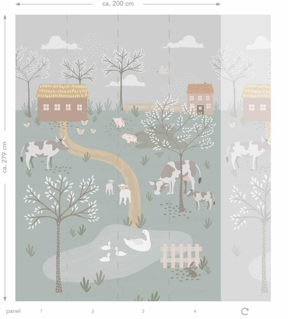 Wandbild 200 x 279 cm Bauernhoftiere 4 Bahnen grüngrau 159242