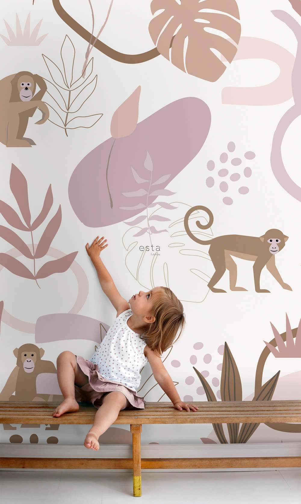 Dieses farblich sanfte und zugleich lebendige Wandbild bringt eine fröhliche Boho-Dschungelstimmung ins Kinderzimmer und begeistert mit seinen charmanten Affenmotiven inmitten stilisierter Naturformen. Verspielt klettern die kleinen Affen durch ein fantasievolles Pflanzenmuster, umgeben von großen Blättern, organischen Formen und feinen Linien in harmonischen Rosa-, Nude- und Pastelltönen. Das Design kombiniert natürliche Motive mit einer modernen, grafischen Sprache, was dem Wandbild einen besonders zeitgemäßen Look verleiht. Die farbliche Gestaltung in zarten Rosatönen auf weißem Grund wirkt luftig und freundlich, ideal für Mädchenzimmer, Babyzimmer oder kreative Spielbereiche. Die Tiere sind kindgerecht illustriert, mit einem freundlichen Ausdruck und weichen Formen, sodass sie zum Lächeln, Entdecken und Erzählen einladen. Das Motiv passt hervorragend zu Möbeln in Holzoptik, zu Accessoires in Naturmaterialien oder zu pastellfarbener Dekoration. Die vier Bahnen ergeben gemeinsam eine großzügige Fläche von 200 x 279 cm, die sich wunderbar als zentrales Wandbild eignet und einen stilvollen Akzent im Raum setzt, ohne überladen zu wirken. Die glatte, matte Oberfläche sorgt für ein ruhiges Erscheinungsbild und bringt die Farben klar und hochwertig zur Geltung. Neben dem auffälligen Design überzeugt die Fototapete durch ihre praktische Handhabung. Sie ist waschbeständig, gut lichtbeständig und kann trocken restlos von der Wand abgezogen werden. Die Anbringung erfolgt über die Wandklebetechnik, bei der der Kleister direkt auf die Wand aufgetragen wird, was eine einfache und saubere Verarbeitung ermöglicht. Das Wandbild ist Teil der beliebten Kollektion To The Moon And Back von Esta Home, einem Hersteller, der für kreative, kindgerechte Designs und hochwertige Materialien bekannt ist. Mit diesem Motiv zieht verspielte Tropenfreude ein, die perfekt zu einer modernen Kinderzimmereinrichtung passt und jeden Tag ein Lächeln auf die Gesichter kleiner Entdeckerinnen zaubert.