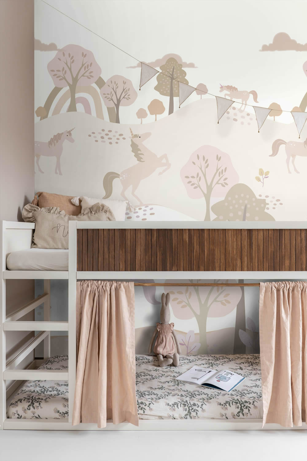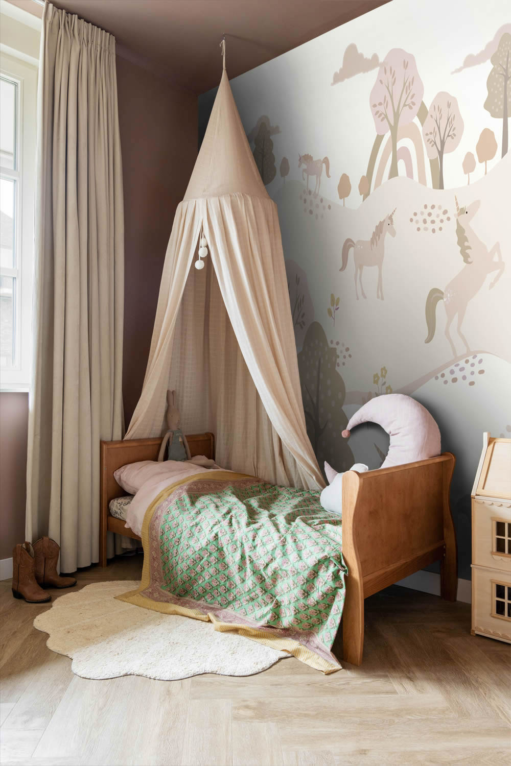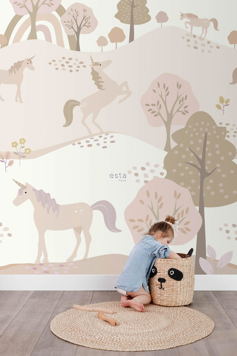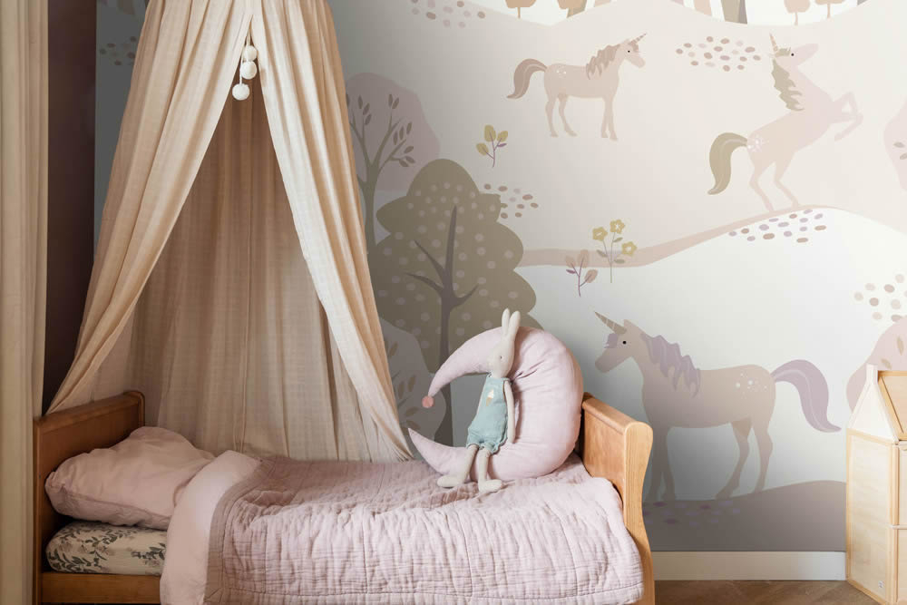 Mit diesem bezaubernden Wandbild zieht eine friedliche Fantasiewelt voller Einhörner in das Kinderzimmer ein. Sanfte Hügel, stilisierte Bäume und ein zarter Regenbogen bilden die Kulisse für eine Gruppe freundlicher Einhörner, die inmitten der Landschaft spazieren, ruhen oder anmutig auf den Hinterbeinen stehen. Das Motiv ist in einem modernen Scandi-Stil gestaltet, mit ruhigen Pastelltönen in Rosa, Beige, Creme und Naturfarben, die eine sanfte, harmonische Atmosphäre schaffen. Die Einhörner selbst sind liebevoll illustriert, mit feinen Details und kindgerechter Darstellung, sodass sie zum Träumen, Staunen und Geschichten erzählen einladen. Dieses Wandbild eignet sich ideal für Babyzimmer, Mädchenzimmer oder Spielbereiche und bringt Ruhe, Fantasie und stilvolle Gestaltung in Einklang. Die Farbgebung fügt sich nahtlos in moderne Einrichtungen ein und harmoniert besonders gut mit Möbeln aus Holz, Textilien in Naturtönen oder Akzenten in Rosé und Flieder. Die Größe von 200 x 279 cm verteilt sich auf vier Bahnen, die gemeinsam eine märchenhafte Szenerie ergeben, ohne den Raum zu überladen. Die glatte, matte Oberfläche sorgt für ein edles Erscheinungsbild und verstärkt die zarte Wirkung der Farben. Neben dem liebevollen Design überzeugt die Tapete auch funktional. Sie ist waschbeständig, gut lichtbeständig und kann trocken restlos von der Wand abgezogen werden. Dank Wandklebetechnik gestaltet sich die Anbringung besonders einfach und sauber, da der Kleister direkt auf die Wand aufgetragen wird. Das Wandbild ist Teil der Kollektion To The Moon And Back von Esta Home, einem Hersteller, der für hochwertige, kreative und kindgerechte Tapeten steht. Dieses Einhorn-Motiv bringt märchenhaften Charme, ruhige Farbwelten und eine kindliche Leichtigkeit ins Zimmer und verwandelt jede Wand in ein magisches Abenteuerland voller Fantasie.
