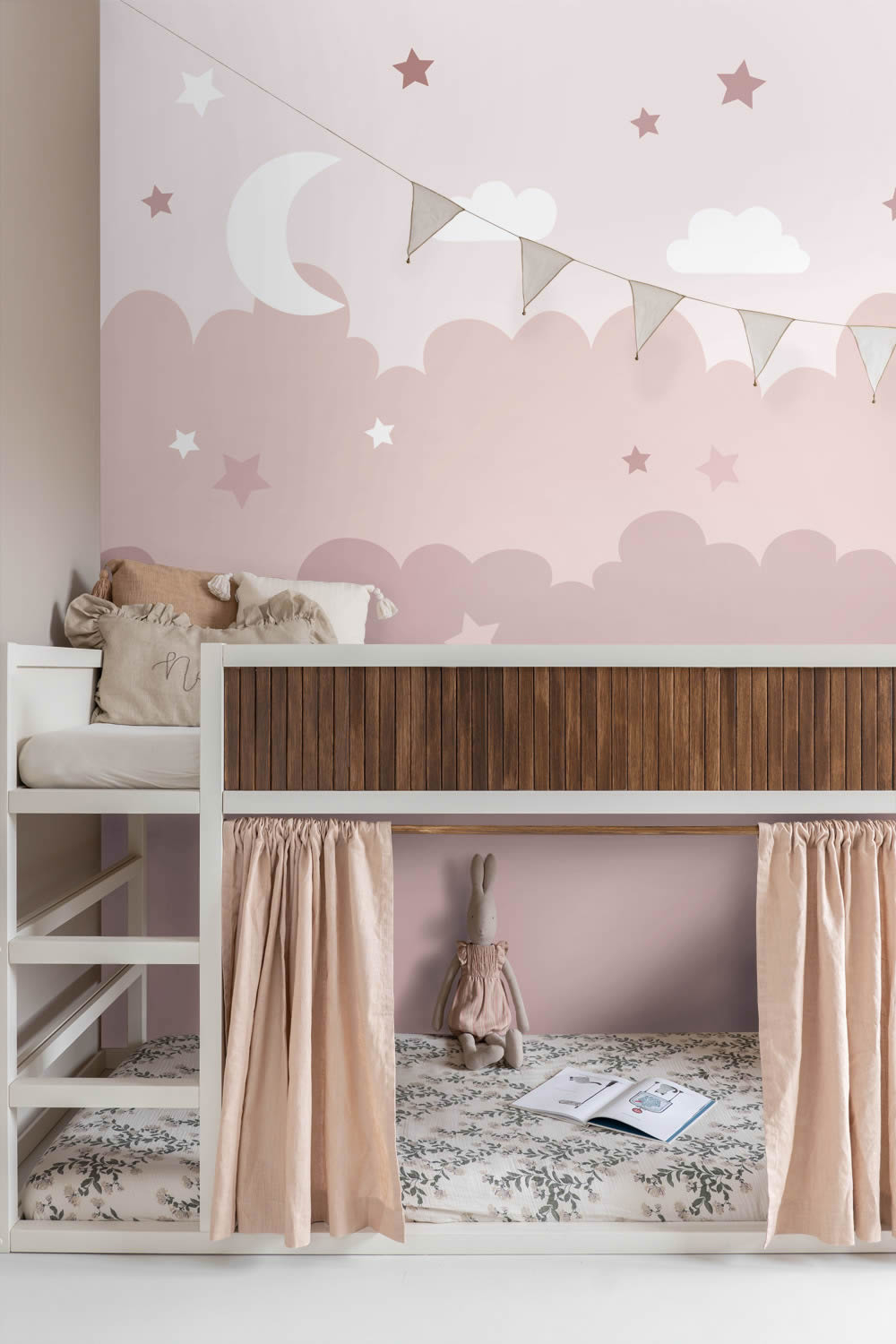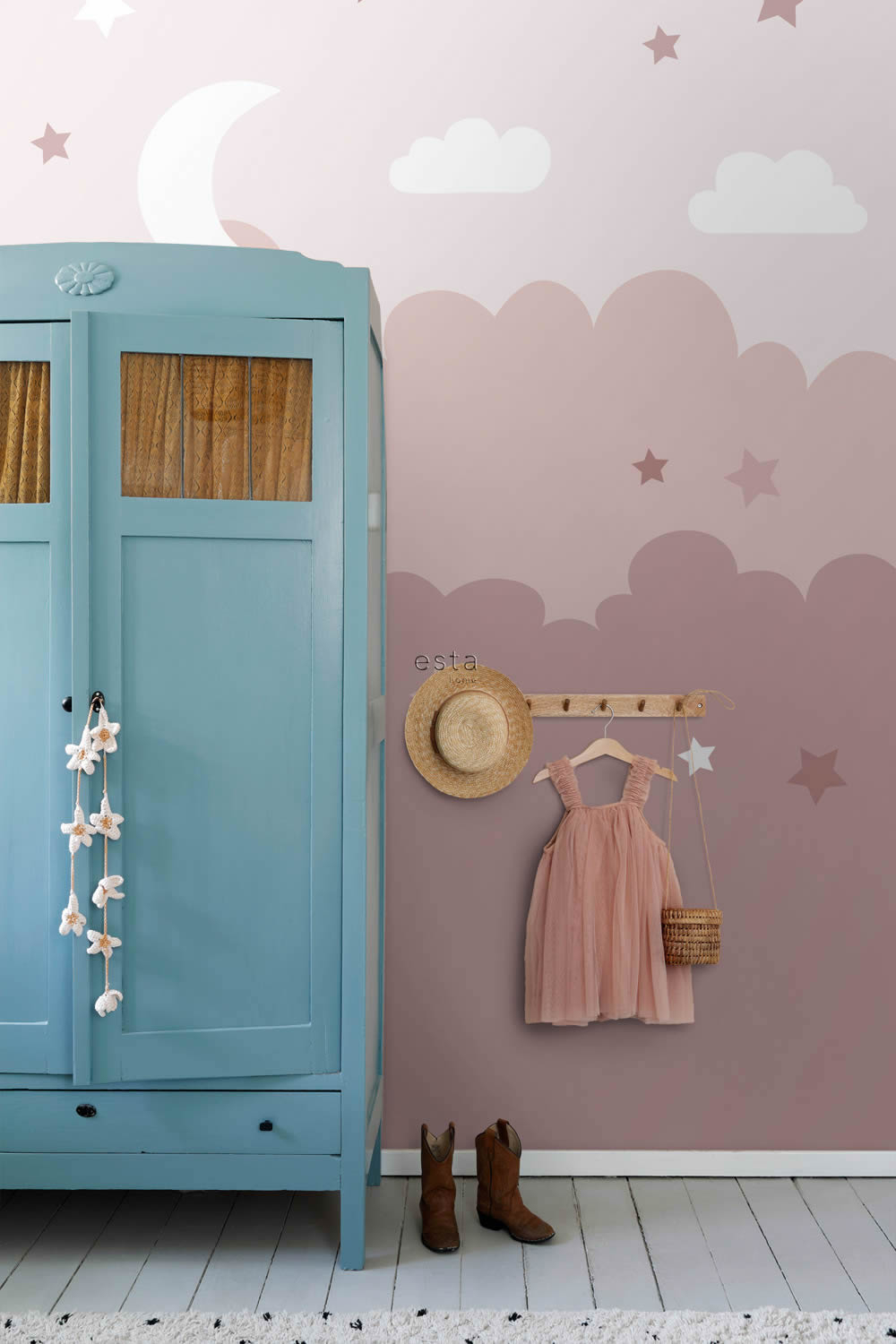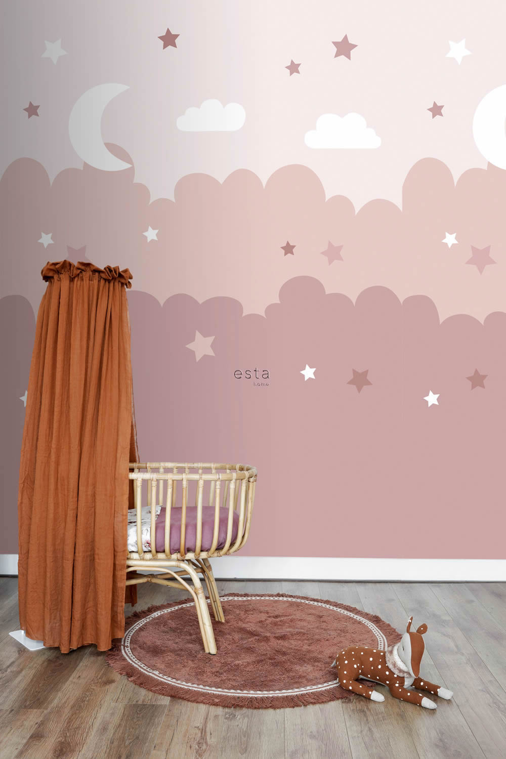 Dieses liebevoll illustrierte Wandbild verwandelt jede Wand in einen ruhigen Abendhimmel voller Magie und Geborgenheit. In einem sanften Verlauf von hellem Rosé bis zu gedecktem Altrosa erstrecken sich weiche Wolkenformen, in denen kleine Sterne in Weiß, Rosa und dunkleren Rosatönen sowie ein leuchtender Halbmond eingebettet sind. Zarte Wolken und kleine Sternenakzente schweben in der oberen Bildhälfte und erzeugen eine ruhige, verträumte Atmosphäre, die ideal für Babyzimmer, Mädchenzimmer und liebevoll eingerichtete Spielbereiche ist. Das Motiv ist im modernen Scandi-Stil gehalten und kombiniert schlichte Formen mit kindgerechtem Charme. Durch die zurückhaltende Farbgestaltung lässt sich das Wandbild wunderbar mit Naturholz, weißen Möbeln, Pastelltextilien und Dekoelementen in Rosé oder Flieder kombinieren. Die vier Bahnen ergeben eine Gesamtgröße von 200 x 279 cm und bilden gemeinsam ein großflächiges Himmelsbild, das als zentrales Gestaltungselement im Raum für Ruhe und Geborgenheit sorgt. Die glatte Oberfläche mit matter Optik unterstreicht den sanften Charakter des Motivs und verhindert unerwünschte Lichtreflexionen. Die Tapete ist nicht nur optisch ein Highlight, sondern auch in ihrer Funktion durchdacht. Sie ist waschbeständig, gut lichtbeständig und kann bei Bedarf trocken und rückstandslos von der Wand entfernt werden. Die Anbringung erfolgt über die Wandklebetechnik, bei der der Kleister direkt auf die Wand aufgetragen wird. Das Wandbild ist Teil der liebevoll konzipierten Kollektion To The Moon And Back von Esta Home, einem Hersteller, der für stilvolles, kindgerechtes Design mit hoher Qualität steht. Mit diesem Himmelsmotiv entsteht eine beruhigende, zauberhafte Umgebung, in der kleine Träumerinnen friedlich spielen, einschlafen und sich geborgen fühlen können.