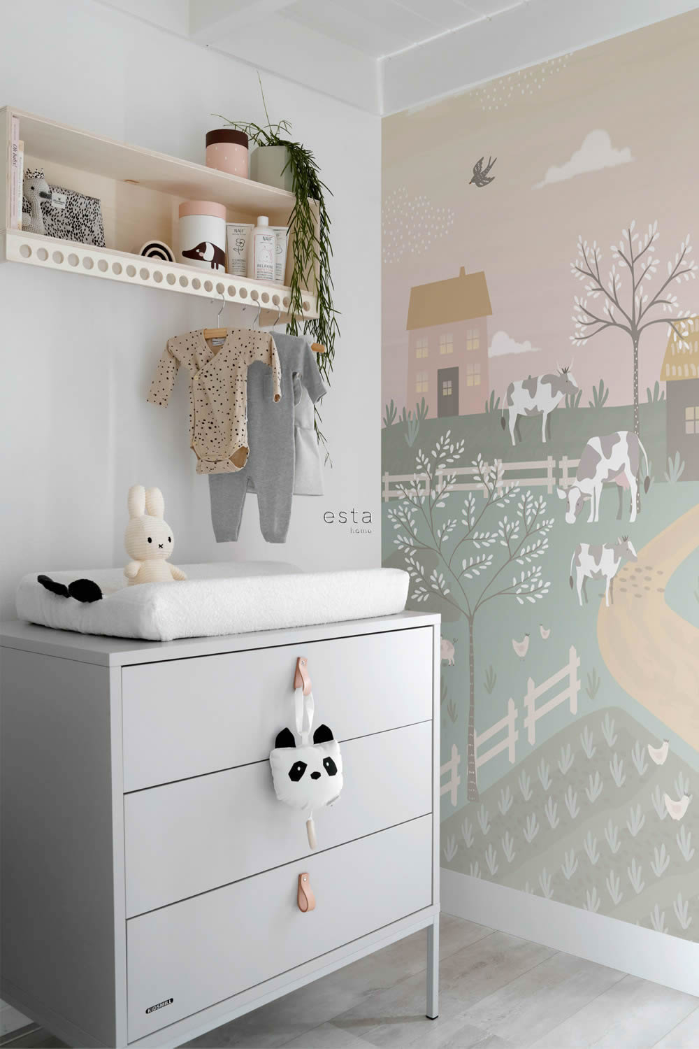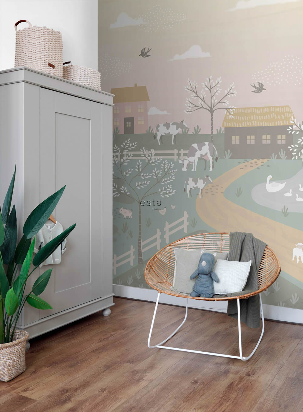 Dieses bezaubernde Wandbild entführt kleine Tierfreunde in eine friedliche Bauernhofwelt voller sanfter Farben und liebevoller Details. Auf einer großzügigen Fläche von 250 x 279 cm entfaltet sich eine ländliche Szenerie mit weiten Wiesen, gepflegten Feldern, kleinen Häusern und typischen Bauernhoftieren wie Kühen, Schweinchen, Hühnern, Ziegen und einem Schwan mit seinen Küken am Teich. Vögel fliegen am pastellfarbenen Himmel, und ein geschwungener Weg verbindet die Elemente zu einer stimmigen Geschichte, die Kinder zum Schauen, Erzählen und Träumen einlädt. Das Farbschema mit zarten Grüntönen, Beige, Rosé und Naturfarben schafft eine ruhige, harmonische Atmosphäre, die ideal für Babyzimmer, Spielbereiche oder Schlafräume kleiner Mädchen und Jungen ist. Die kindgerechte Illustration ist stilisiert, aber detailreich, sodass sich immer wieder neue Dinge entdecken lassen. Die Darstellung ist bewusst ruhig gehalten und unterstützt ein geborgenes Raumgefühl. Besonders schön wirkt dieses Motiv in Kombination mit Möbeln aus hellem Holz, weichen Textilien in Naturtönen oder pastellfarbenen Accessoires. Die fünf Bahnen lassen sich leicht anbringen und ergeben gemeinsam ein durchgehendes Bild ohne harte Übergänge. Die glatte, matte Oberfläche verstärkt die edle Wirkung und sorgt dafür, dass die Farben sanft und blendfrei zur Geltung kommen. Auch praktisch überzeugt dieses Wandbild auf ganzer Linie. Es ist waschbeständig, gut lichtbeständig und lässt sich bei Bedarf trocken und rückstandslos entfernen. Die Anbringung erfolgt mithilfe der Wandklebetechnik, bei der der Kleister direkt auf die Wand aufgetragen wird, was die Verarbeitung besonders unkompliziert macht. Dieses Motiv stammt aus der Kollektion To The Moon And Back des Herstellers Esta Home und verbindet fantasievolle Gestaltung mit hoher Qualität. Es lädt Kinder jeden Alters ein, in eine idyllische Bauernhofwelt einzutauchen und sich in einem Raum voller Wärme, Natur und Geborgenheit wohlzufühlen.