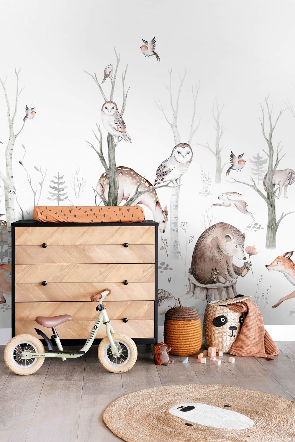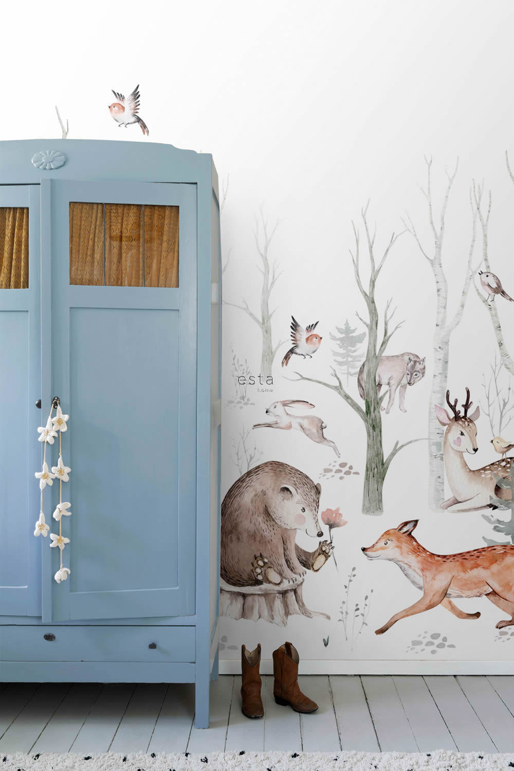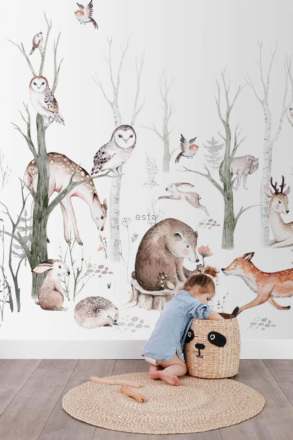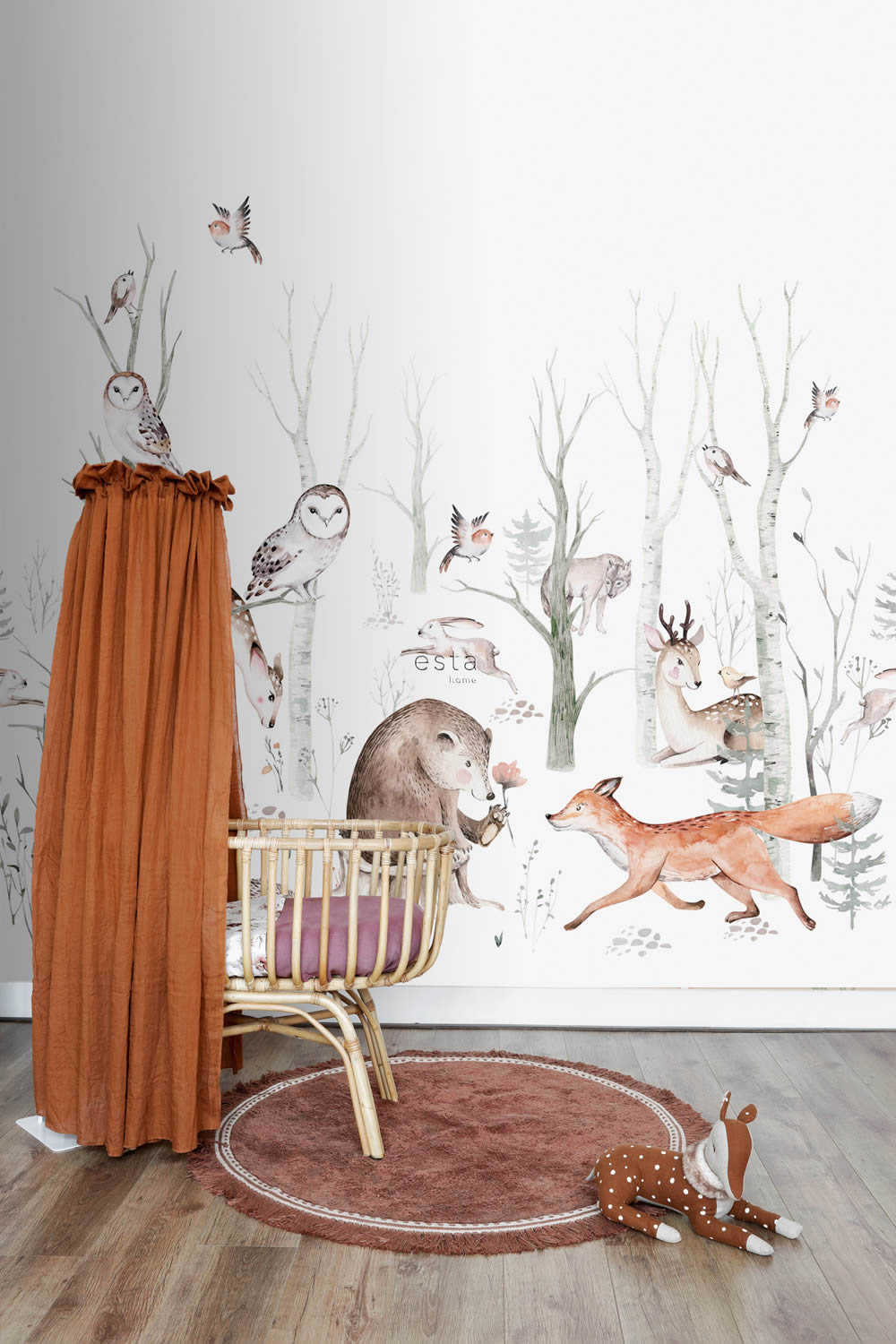 Dieses wunderschöne Wandbild verwandelt das Kinderzimmer in eine sanfte Waldlandschaft, in der Rehe, Eulen, Hasen, Füchse und andere Waldbewohner friedlich nebeneinander leben. Auf einem ruhigen weißen Hintergrund entfaltet sich eine detailreiche Szenerie mit hellen, zarten Baumstämmen, fliegenden Vögeln und grasenden Tieren. Die harmonisch abgestimmten Farben in Naturtönen wie Braun, Grau, Beige und sanften Akzenten in Rosa und Grün schaffen eine beruhigende, freundliche Atmosphäre, die sich ideal für Babyzimmer, Kleinkindräume und Spielbereiche eignet. Besonders die feinen Aquarellillustrationen verleihen dem Motiv eine besondere Leichtigkeit und lassen die Tiere lebendig, aber nie aufdringlich wirken. Kinder können immer wieder neue Tiere entdecken und eigene Geschichten erfinden. Die Kombination aus ruhigem Weiß und natürlichen Farbdetails fügt sich hervorragend in moderne, skandinavische oder minimalistisch gestaltete Räume ein. Besonders schön wirkt das Wandbild in Kombination mit Holz, Naturmaterialien und pastelligen Textilien. Mit einer Breite von 250 cm und einer Höhe von 279 cm verteilt sich das Motiv auf fünf Bahnen, die gemeinsam eine großflächige, aber harmonische Szene ergeben. Die glatte, matte Oberfläche sorgt dafür, dass keine Lichtreflexe entstehen und die sanften Farben besonders gut zur Geltung kommen. Auch funktional überzeugt die Tapete mit durchdachten Eigenschaften. Sie ist waschbeständig, gut lichtbeständig und lässt sich bei Bedarf trocken und restlos abziehen. Die Anbringung erfolgt über die Wandklebetechnik, bei der der Kleister direkt auf die Wand aufgetragen wird. Das Wandbild stammt aus der Kollektion To The Moon And Back von Esta Home und steht für liebevolle Gestaltung, kindgerechtes Design und hohe Qualität. Dieses Waldmotiv bringt Ruhe, Natur und eine Prise Fantasie ins Kinderzimmer und schafft einen Ort zum Träumen, Spielen und Wohlfühlen.