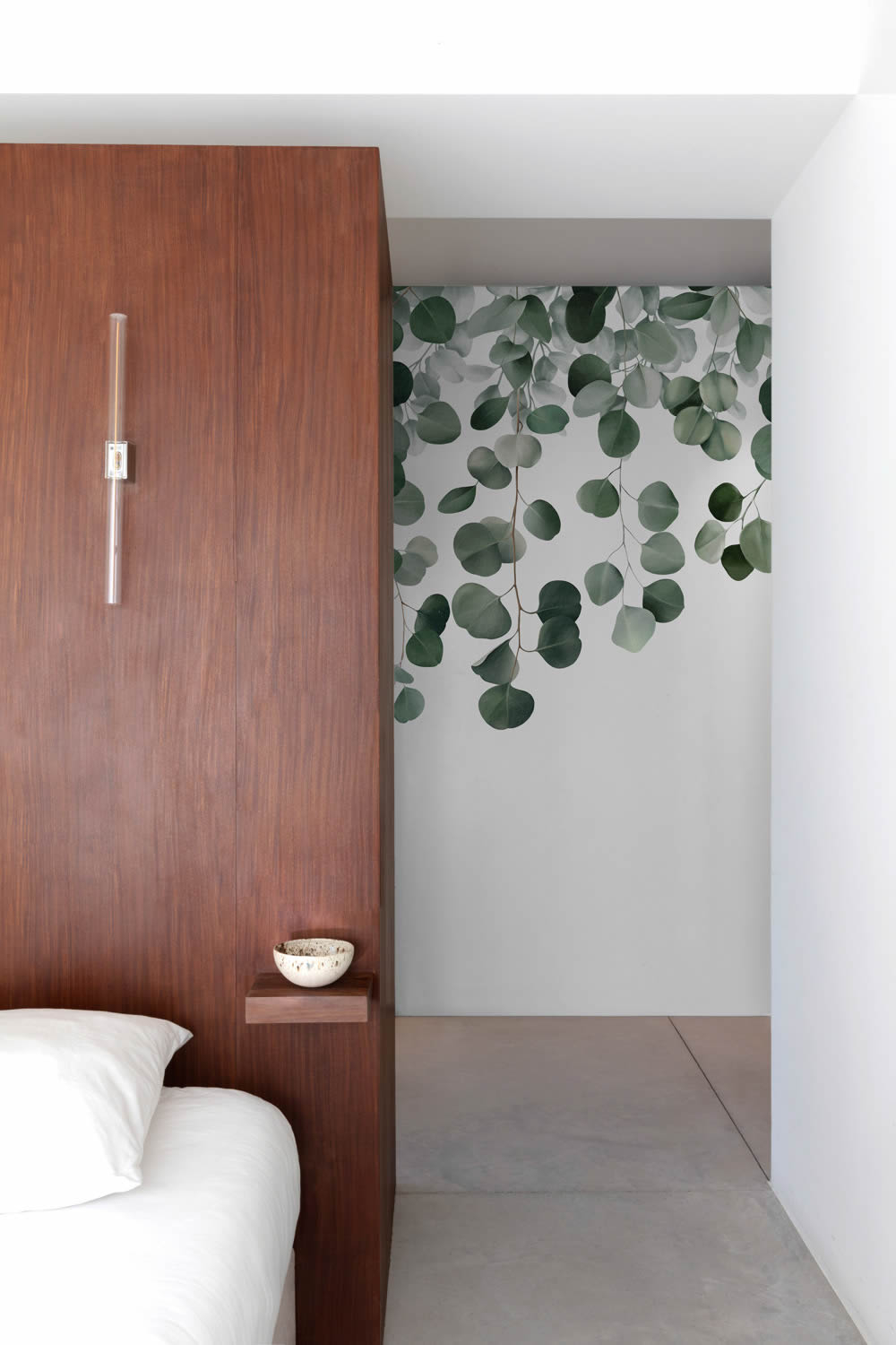 Dieses Wandbild verwandelt jede Wandfläche in eine stilvolle Naturkomposition mit sanft fallenden Eukalyptus-Ranken, die von oben ins Bild hineinragen. Die runden Blätter in verschiedenen Grüntönen wirken zart und realistisch, als würden sie sich leicht im Wind bewegen. Die Äste sind locker arrangiert und ergeben eine offene, luftige Gestaltung, bei der viel Weißraum bleibt. Dieser bewusste Einsatz von Fläche erzeugt eine moderne, beruhigende Optik, die Leichtigkeit vermittelt und gleichzeitig Struktur bietet. Die Farbpalette reicht von tiefem Salbeigrün über gedeckte Olivtöne bis hin zu hellen, fast silbrigen Nuancen, was dem Bild eine natürliche Vielfalt verleiht. Der weiße Hintergrund sorgt für Klarheit und macht das Motiv besonders leuchtend. Das Design eignet sich hervorragend für Jugendzimmer, Schlafzimmer oder kreative Wohnbereiche, in denen eine ruhige, naturnahe Atmosphäre gewünscht ist. Auch in Fluren oder Arbeitsbereichen kann es als dezentes gestalterisches Element eingesetzt werden. Die fein strukturierte Oberfläche verleiht dem Wandbild eine angenehme Haptik und unterstreicht die natürliche Wirkung der Eukalyptusblätter. Die matte Ausführung reduziert Lichtreflexe und lässt das Motiv gleichmäßig und hochwertig erscheinen. Mit einer Größe von 1,59 mal 2,80 Metern ist das Wandbild ideal für Akzentwände oder kleinere Wandflächen geeignet. Die ansatzfreie Gestaltung erleichtert das Anbringen, da kein Musteranschluss erforderlich ist. Die Wandklebetechnik ermöglicht eine einfache und saubere Verarbeitung, bei der die Tapete trocken auf die eingekleisterte Wand aufgebracht wird. Die Oberfläche ist hoch waschbeständig und damit auch für den Alltag bestens geeignet. Bei Bedarf kann die Tapete trocken und rückstandsfrei wieder entfernt werden. Dieses Wandbild bietet eine moderne Interpretation natürlicher Formen und kombiniert ruhige Farbgebung mit hochwertiger Ausführung für eine stilvolle Wandgestaltung.