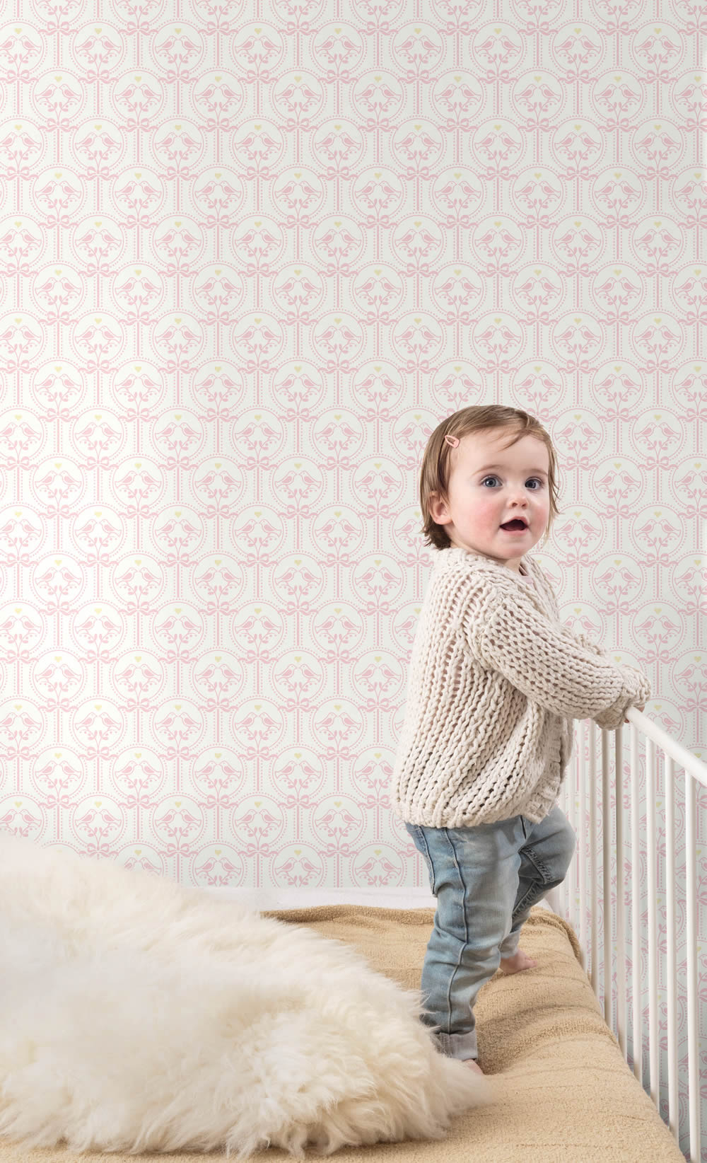 JS3205 Verzierungen Tapete aus der Kollektion Jack n Rose von Grandeco. Mit dieser Tapete gestalten Sie ein filigran und romantisches Kinderzimmer mit Schleifen und Vögel. Die Struktur und Oberfläche sind matt und fein strukturiert. Das Format ist 0,53 x 10,05. Schöne Kindertapeten Tapete für ein weiß und rosa Kinderzimmer.
