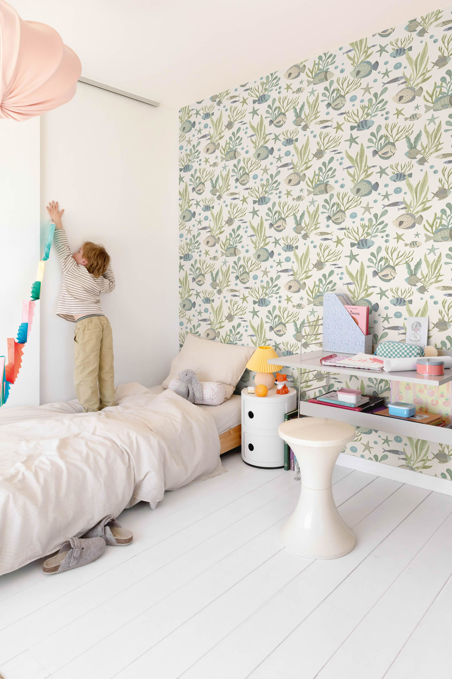 Diese Vliestapete bringt eine fröhliche Unterwasserwelt ins Kinderzimmer und begeistert mit liebevoll gezeichneten Fischen, die sich auf einem weißen Hintergrund tummeln. Das Motiv ist kindgerecht gestaltet und weckt die Fantasie kleiner Entdeckerinnen und Entdecker. Die harmonische Farbgebung in Kombination mit der klaren Struktur sorgt für eine angenehme Leichtigkeit und lässt den Raum größer und heller wirken. Durch die neutrale Basisfarbe Weiß lässt sich die Tapete vielseitig mit Möbeln, Textilien oder Wandfarben kombinieren und passt sowohl in das Zimmer von Mädchen als auch Jungen. Die matte, fein strukturierte Oberfläche unterstreicht die hochwertige Anmutung des Motivs und schafft eine sanfte, wohnliche Atmosphäre. Mit einem versetzten Ansatz von 64 cm ergibt sich ein fließender Musterverlauf an der Wand. Die Anwendung ist dank Wandklebetechnik besonders benutzerfreundlich, da die Tapete direkt auf die eingekleisterte Wand aufgebracht wird. Beim Entfernen lässt sie sich trocken und rückstandslos abziehen. Die hohe Wasch- und Scheuerbeständigkeit macht sie bestens geeignet für den Alltag im Kinderzimmer. Auch bei starker Sonneneinstrahlung bleibt die Farbintensität durch gute Lichtbeständigkeit lange erhalten. Diese Tapete verbindet ein kindgerechtes Meeresweltmotiv mit praktischen Eigenschaften und schafft eine frische, inspirierende Umgebung für kleine Abenteurer.