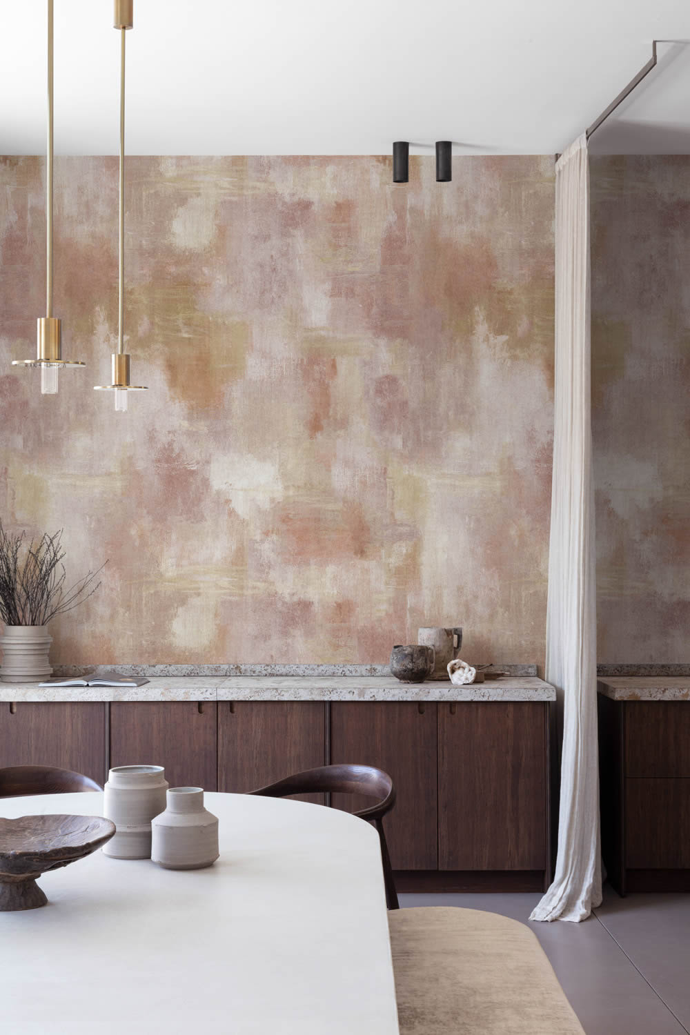 Mit dieser Fototapete im Maß 159 x 280 cm zieht ein zurückhaltend künstlerisches Wandbild ein, das eine Beton- oder Putzoptik in natürlichen Farbtönen simuliert. Die Oberfläche wirkt wie von Hand gespachtelt, mit lasierenden Schichten in warmem Beige, gebrochenem Weiß, sanftem Ocker, zartem Braun und Terrakottatönen. Die Farbübergänge sind weich und unregelmäßig, wodurch ein lebendiger, aber dennoch beruhigender Eindruck entsteht. Die Darstellung erinnert an eine Wand mit Patina, wie man sie aus Künstlerateliers oder mediterranen Innenräumen kennt. Diese Tapete eignet sich ideal für Jugendzimmer, moderne Wohnbereiche oder Arbeitszimmer, in denen ein natürlicher, texturierter Hintergrund gefragt ist. Trotz ihrer strukturierten Anmutung bleibt die Oberfläche glatt und matt, was für eine angenehme Haptik sorgt und gleichzeitig Lichtreflexe vermeidet. Die Farben wirken in Kombination mit Holz, Naturmaterialien oder minimalistischem Mobiliar besonders harmonisch. Durch die Wandklebetechnik lässt sich die Tapete einfach und sauber anbringen. Sie ist hoch waschbeständig, lichtbeständig und kann bei Bedarf trocken und ohne Rückstände entfernt werden. Dieses Wandbild ist eine ideale Lösung für alle, die einen modernen, erdigen Stil bevorzugen und Wände mit Tiefe und Charakter gestalten möchten.