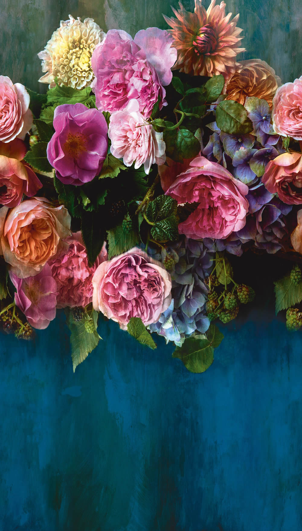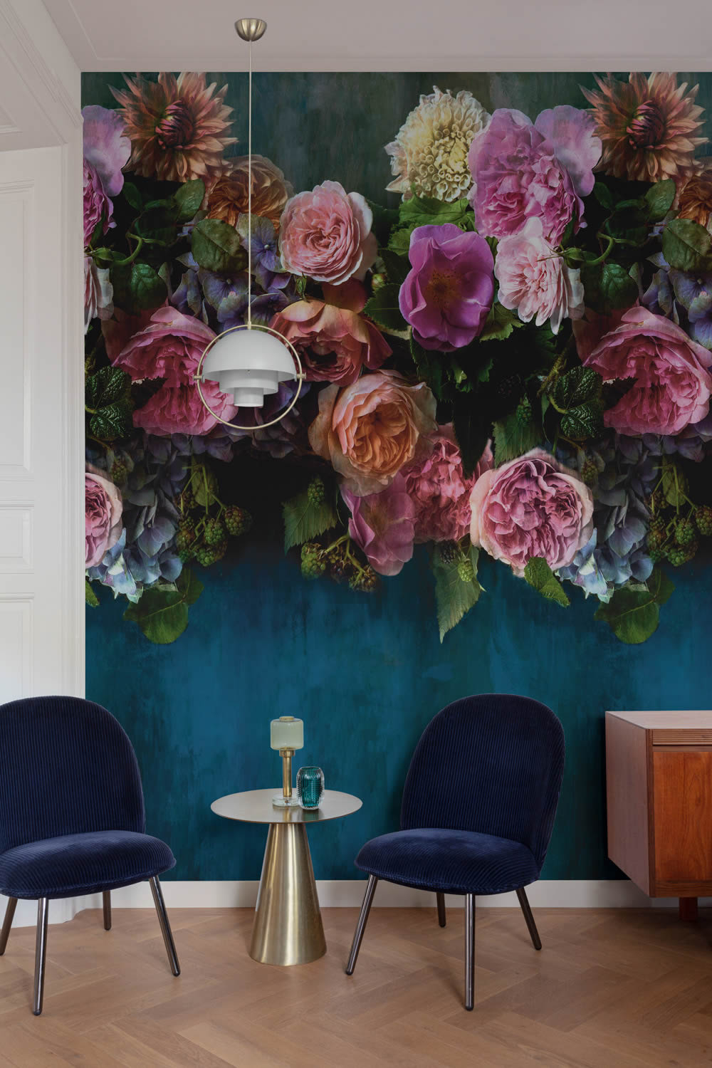Dieses eindrucksvolle Wandbild vereint kräftige Farben und florale Eleganz zu einer opulenten Inszenierung, die jeder Wand Tiefe und Ausdruck verleiht. Auf einem satten, strukturiert wirkenden Hintergrund in dunklem Blau und Petrol entfaltet sich ein prachtvoller Strauß aus Rosen, Dahlien, Hortensien, Pfingstrosen und weiteren Blüten, die in unterschiedlichen Farbtönen von intensivem Pink, Violett, Koralle, Orange und Apricot leuchten. Die Blätter und Stängel sind in sattem Grün gehalten, wodurch sich ein natürlicher Ausgleich zur Farbfülle der Blüten ergibt. Der Aquarellstil der Darstellung wirkt wie gemalt, mit weichen Übergängen und einer leichten Tiefenunschärfe, die das Motiv lebendig und stimmungsvoll erscheinen lässt. Die matte Oberfläche der Tapete unterstreicht diesen Effekt und verhindert störende Lichtreflexionen, sodass das Wandbild auch bei direkter Beleuchtung seine Wirkung behält. Mit einem Maß von 159 mal 280 Zentimetern verteilt auf drei Bahnen eignet sich dieses florale Motiv hervorragend für eine dominante Akzentwand, etwa im Schlafzimmer, im Wohnbereich oder im Jugendzimmer. Die Wandklebetechnik ermöglicht ein einfaches Anbringen, da der Kleister direkt auf die Wand aufgetragen wird. Die hohe Waschbeständigkeit macht das Produkt pflegeleicht, und durch die gute Lichtbeständigkeit behalten die Farben auch bei Sonneneinstrahlung lange ihre Leuchtkraft. Diese Tapete richtet sich vor allem an Mädchen und Teenager, die ihren Raum mit einem künstlerischen und romantischen Flair gestalten möchten. Der Mix aus Vintage Charme und dramatischer Farbwirkung passt sowohl zu modernen Einrichtungen mit schlichten Formen als auch zu verspielten, klassischen Möbeln. Accessoires in Gold oder Messing, helle Holztöne oder Samtstoffe verstärken die Wirkung dieses auffälligen Wandmotivs zusätzlich. Da die Tapete trocken restlos abziehbar ist, eignet sie sich auch für temporäre Raumlösungen oder wechselnde Gestaltungskonzepte.