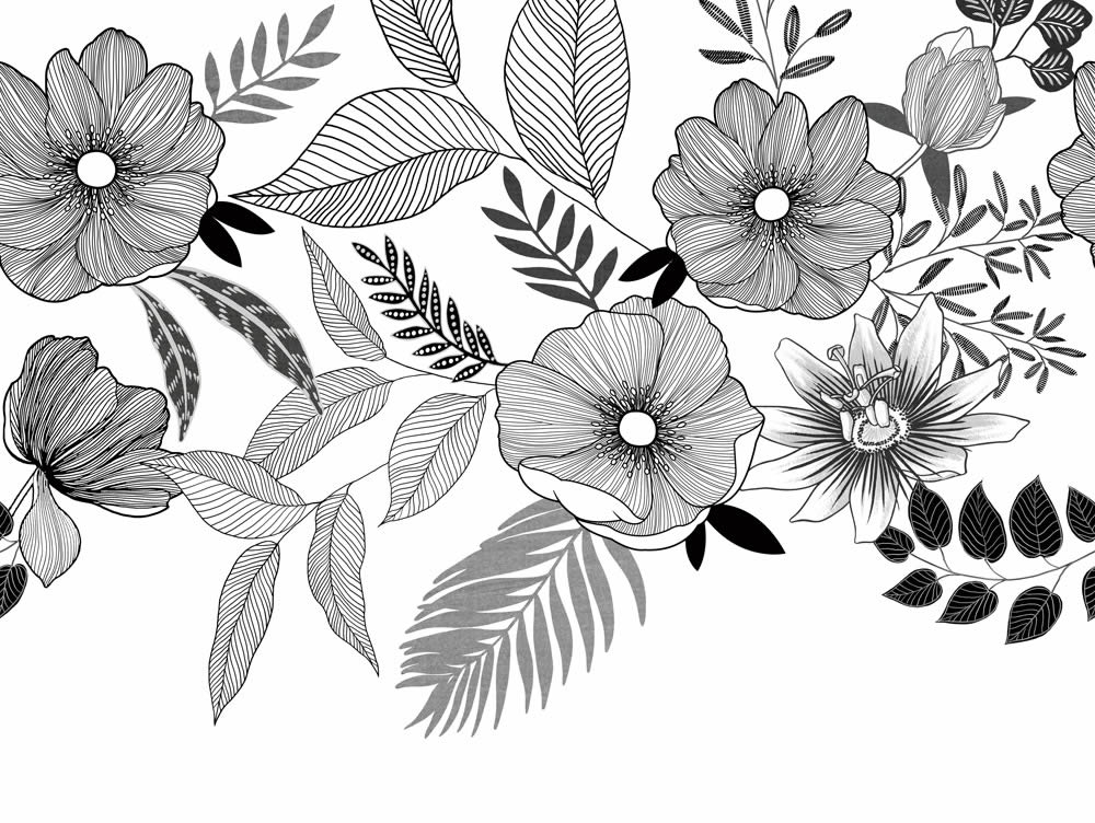 Dieses Wandbild in Schwarz-Weiß vereint florale Eleganz mit grafischer Klarheit und verwandelt jede Wand in eine kunstvolle Illustration. Die Fototapete zeigt ein detailreiches Arrangement aus großen Blüten, filigranen Blättern und dekorativen Pflanzenmotiven, die wie von Hand gezeichnet wirken. Durch die kontrastreiche Gestaltung entsteht eine lebendige Dynamik, während die monochrome Farbgebung zugleich für eine ruhige und stilvolle Raumwirkung sorgt. Die matte, glatte Oberfläche unterstreicht den künstlerischen Charakter des Motivs und fügt sich harmonisch in moderne Einrichtungskonzepte ein. Besonders in Jugendzimmern oder kreativen Bereichen wie Ateliers, Leseecken oder Homeoffices entfaltet das Motiv seine volle Wirkung und setzt ein starkes gestalterisches Statement. Die Tapete ist hoch waschbeständig und überzeugt durch ihre praktische Wandklebetechnik, bei der der Kleister direkt auf die Wand aufgetragen wird. Dadurch lässt sie sich nicht nur leicht anbringen, sondern bei Bedarf auch trocken und rückstandslos entfernen. Dank ihrer guten Lichtbeständigkeit bleiben die Kontraste lange erhalten und das Motiv wirkt dauerhaft frisch und ausdrucksstark. Als dekoratives Wandbild bietet diese Fototapete eine ideale Möglichkeit, große Wandflächen stilvoll zu inszenieren und dem Raum eine persönliche Note zu verleihen.