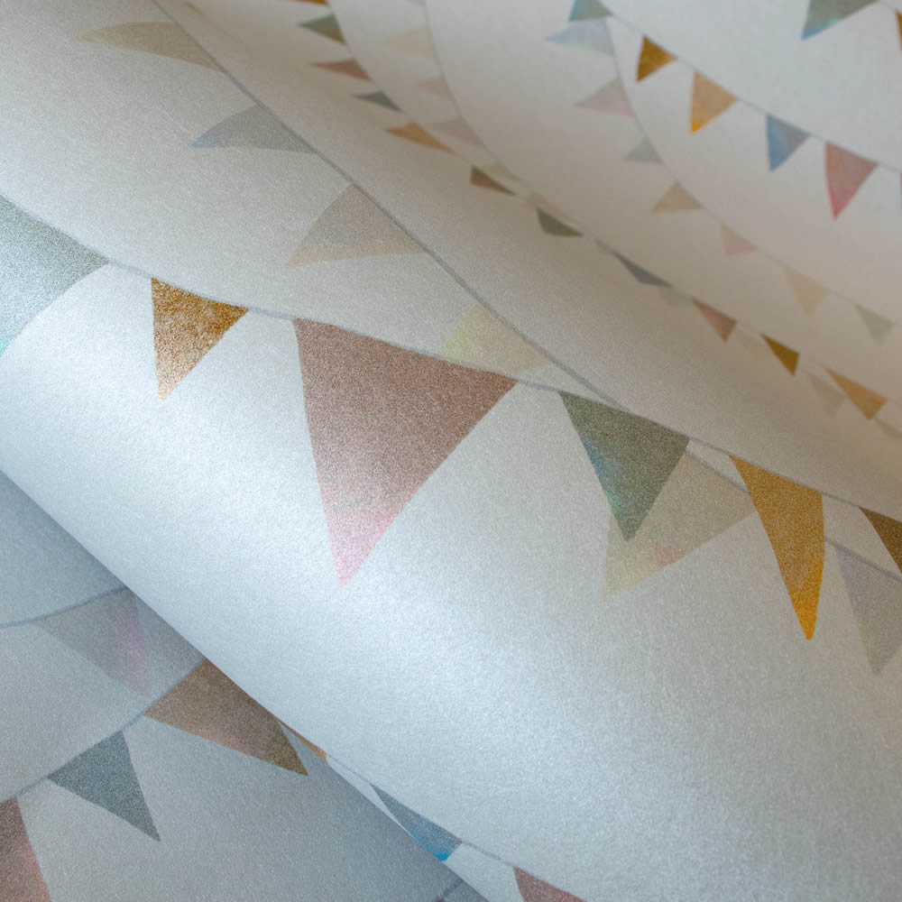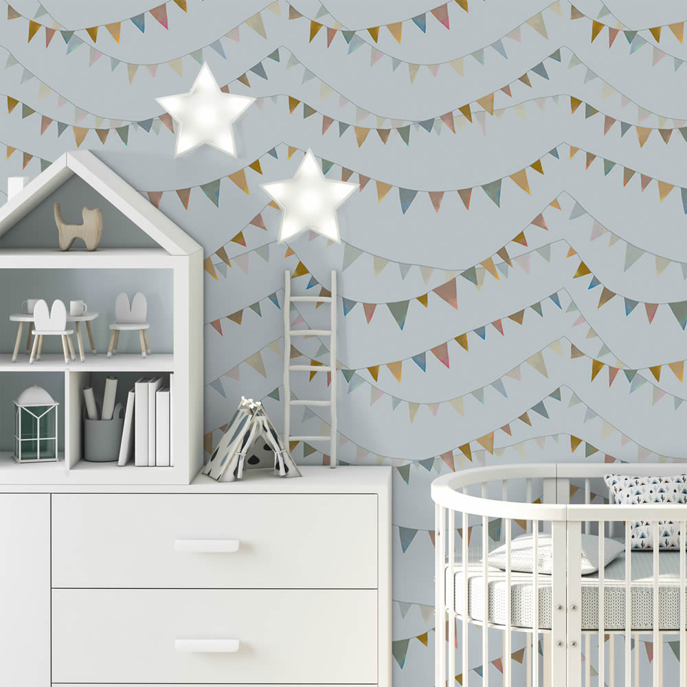 Auf dieser Vliestapete für Jungs und Mädchen zeigt Hohenberger Girlanden-Motive. Lets Party für die Wände im Kinderzimmer. Die Tapeten von Hohenberger sind Made in Germany, PVC frei und Nachhaltig Die Oberfläche ist gänzend und glatt und das Format 0,53 x 10,05 m. Wimpelketten Tapeten für ein hellblaues Kinderzimmer.