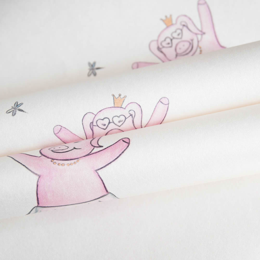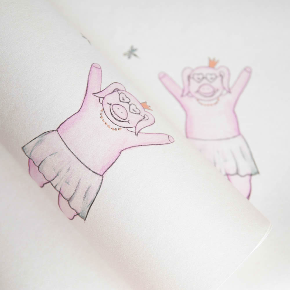 Vliestapete mit fröhlichen tanzenden Schweinchen in Rosa auf elfenbeinfarbenem Hintergrund für eine verspielte und märchenhafte Wandgestaltung. Die liebevoll gestalteten Motive sorgen für eine warme und fantasievolle Atmosphäre, ideal für Kinderzimmer. Die hochwertige Vliestapete von Hohenberger ist waschbeständig, gut lichtbeständig und kann trocken restlos abgezogen werden. Dank der Wandklebetechnik ist die Anbringung besonders einfach. Die glänzende, glatte Oberfläche hebt die niedlichen Illustrationen hervor und verleiht dem Design eine lebendige Optik.