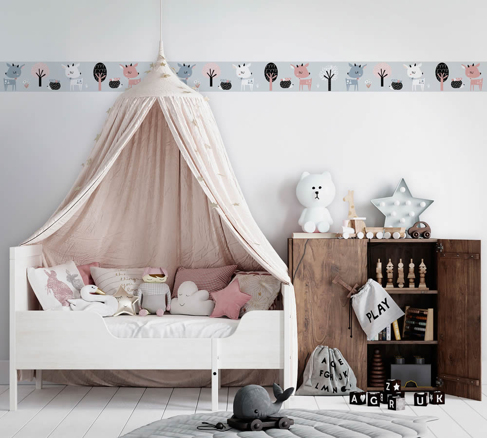 Blumen und Bäume und eine Wandgestaltung zum Thema Rehe und Bäume sorgen hier 45832 für leuchtende Kinderaugen. Bordüren haben den großen Vorteil, dass sie nicht wie eine Tapete vollflächig über die ganze Wand tapeziert werden müssen und sich somit ganz schnell und einfach ein neuer Look im Mädchenzimmer kreeiren lässt. Bei der Platzierung können Sie Ihrer Kreativität freien Lauf lassen. Waldtiere sind ein Gestaltungsschwerpunkt dieser niedlichen Kinderkollektion für das Mädchen-Zimmer. Die Borte hat das Format 5,00 x 0,18 m und die Oberfläche ist matt und glatt. Werden Sie zum Innenarchitekt Ihres Mädchenzimmers und gestalten Sie die Wände mit Tapetenprodukten aus Vlies aus der Kollektion Kids Walls von Marburg. Rehe und Bäume Borte gestalten das Mädchenzimmer kindgerecht und süß in grau und bunt und sorgen für einen altersgerechten Rückzugsort für Kids. Rehe und Bäume-Motive verwandeln das Mädchenzimmer ohne großen Aufwand in ein Mottozimmer. Vlies-Borten lassen sich einfach und schnell verarbeiten und dank der Qualität von Marburg sind sie hochwertig und strapazierfähig. Rehe und Bäume Borte als Eyecatcher hinter dem Bett oder dem Sideboard im Mädchenzimmer.