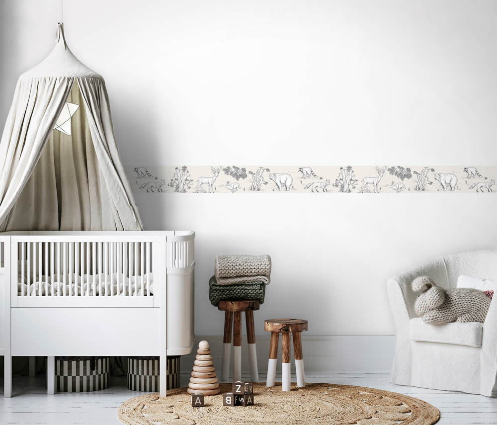 Kids lieben die Farbe beige und grau, Waldtiere Borte und Wildnis und Tiere-Motive. Lassen Sie Ihrer Kreativität feien Lauf. Tapezieren Sie Bordüren mittig auf der Wand, als Abtrennung zwischen 2 Farbflächen, um Möbel drumherum oder als Eyecatcher direkt über dem Bett auf Augenhöhe der Kids. Eine Borüre lässt sich einfach und schnell verarbeiten und sorgt im Handumdrehen für einen Look im Kinderzimmer. Mit dieser Borte spielen und schlafen Ihre Kinder in einem Kinderzimmer im abenteuerlichen Look und Träumen von Füchse und Rehe. Die Borte hat das Format 5,00 x 0,18 m und die Oberfläche ist matt und glatt. Um den Wünschen Ihrer Kids gerecht zu werden lässt sich diese Borte mit vielen weiteren Marburg-Produkten und Tapeten kombinieren. Mit der beige und grauen Borte gestalten Sie das Kinderzimmer ganz nach den Wünschen Ihres Kindes. Themen-Kinderzimmer für Kids. Die Wandklebetechnik ist ein großer Vorteil von Borten aus dem Material Vlies. Eine Borte setzt einzelne Wände gezielt in Szene und lässt sich gut mit Farben oder Unitapeten kombinieren.