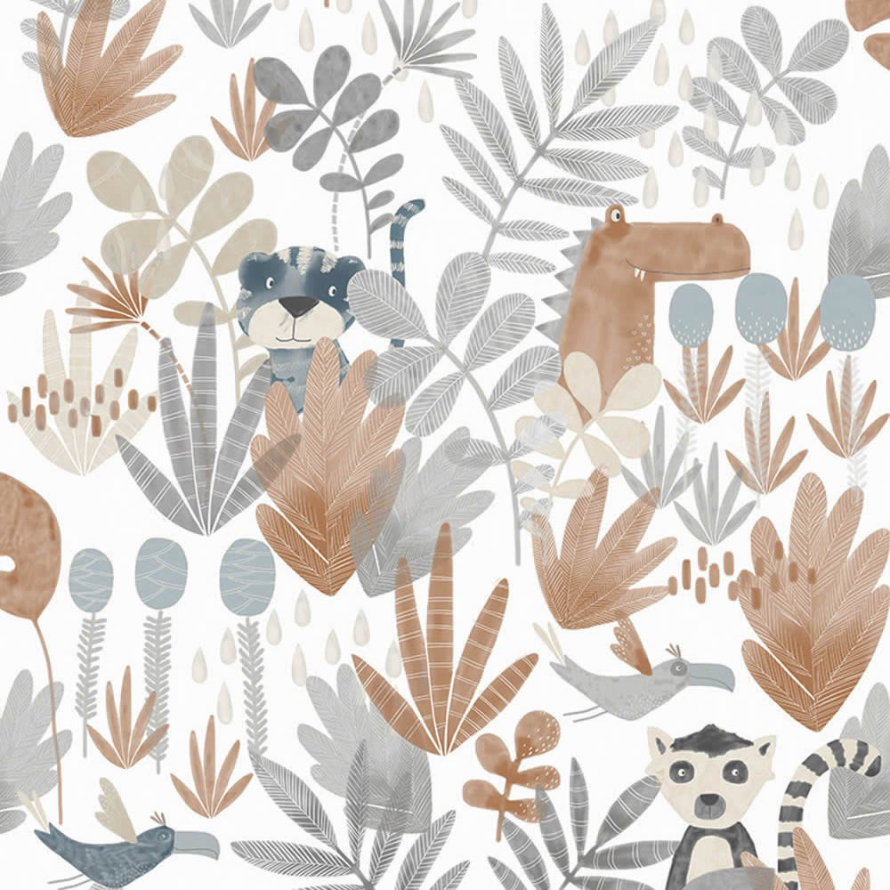 Diese Vliestapete entführt Kinder in ein aufregendes Dschungelabenteuer und bringt eine fantasievolle Atmosphäre ins Zimmer. Die liebevoll gestalteten Motive zeigen einen niedlichen Tiger, ein lächelndes Krokodil und einen neugierigen Lemur, die sich zwischen dichten tropischen Pflanzen verstecken. Die Farbgebung in sanften Taupe- und Grünblautönen auf hellem Hintergrund verleiht dem Design eine harmonische und moderne Optik. Die detailreichen Blätter und Tiere sorgen für eine lebendige, aber dennoch beruhigende Wandgestaltung. Die glatte, matte Oberfläche unterstreicht die hochwertige Verarbeitung und schafft eine angenehme Haptik. Dank des versetzten Ansatzes von 64 cm entsteht ein dynamisches, aber dennoch ausgewogenes Musterbild. Die hochwertige Vliesqualität ermöglicht eine unkomplizierte Anbringung mit der Wandklebetechnik. Der Kleister wird direkt auf die Wand aufgetragen, sodass die Bahnen mühelos angebracht werden können. Neben der einfachen Verarbeitung überzeugt die Tapete mit praktischen Vorteilen. Sie ist gut lichtbeständig, wasserbeständig und kann trocken restlos entfernt werden, wodurch sie besonders pflegeleicht und langlebig ist. Diese Dschungel-Tapete eignet sich perfekt als fröhliche Akzentwand oder als vollständige Raumgestaltung für kleine Entdecker.
