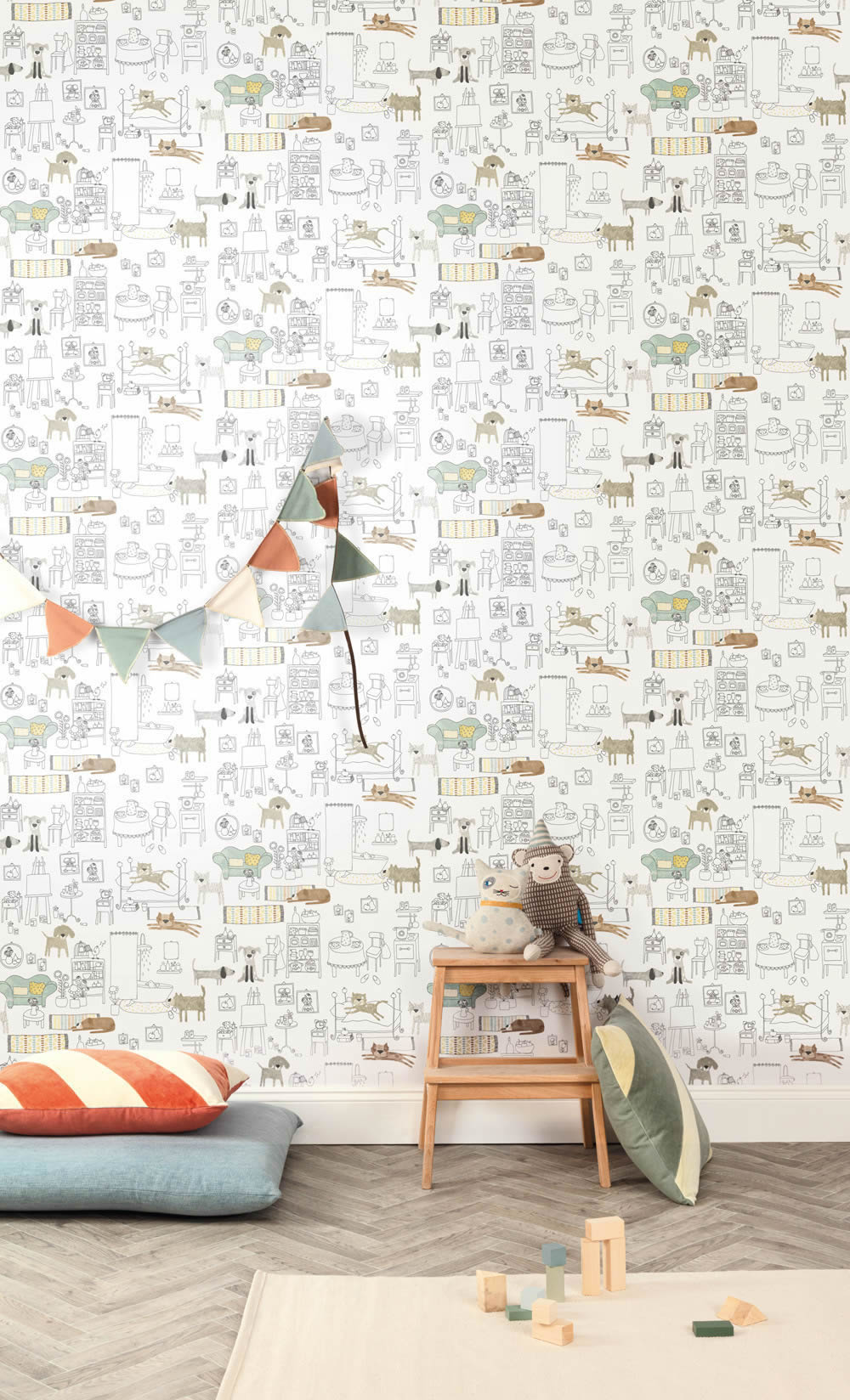 Diese fröhliche Vliestapete mit Hunden, Katzen und liebevoll illustrierten Wohnaccessoires bringt eine spielerische und gemütliche Atmosphäre ins Kinderzimmer. In einem detailreichen Cartoon-Stil gestaltet, zeigt sie Haustiere, die entspannt auf Möbeln liegen, durch das Zimmer streifen oder neugierig ihre Umgebung erkunden. Die Farbgebung in Beige, Grün und Naturtönen sorgt für eine harmonische Optik, die sich perfekt in verschiedene Einrichtungsstile einfügt. Die glatte, matte Oberfläche unterstreicht die hochwertige Gestaltung. Dank Wandklebetechnik ist die Anbringung besonders einfach und die Tapete kann trocken restlos entfernt werden. Sie ist wasserbeständig und gut lichtbeständig.