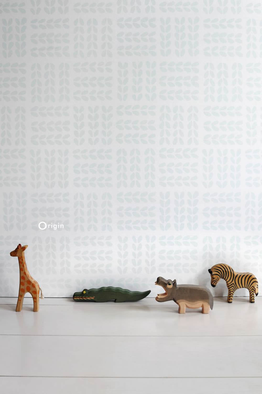 Auf der creme-weißen Vliestapete sorgen kleine mint-grüne Blätter für ein natürliches Ambiente.
