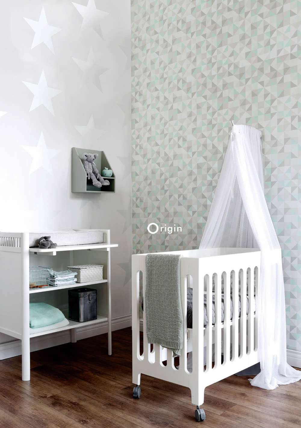 Je nach Lichteinfall glänzen die silbernen Sterne auf der creme-weißen Vliestapete.