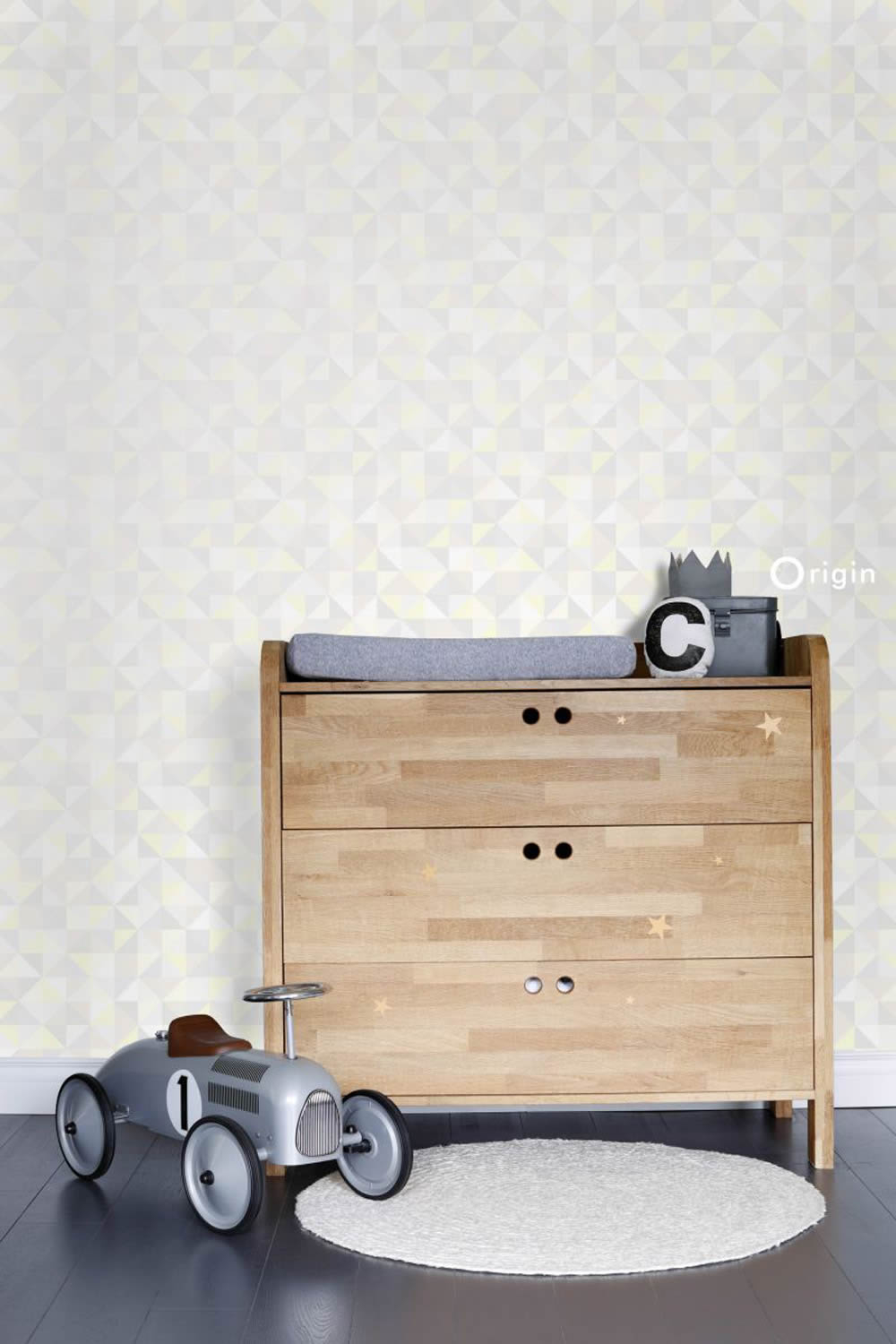 Zarte gold-glänzende Dreiecke heben sich von den anderen Dreiecken der Vliestapete im Babyzimmer ab.