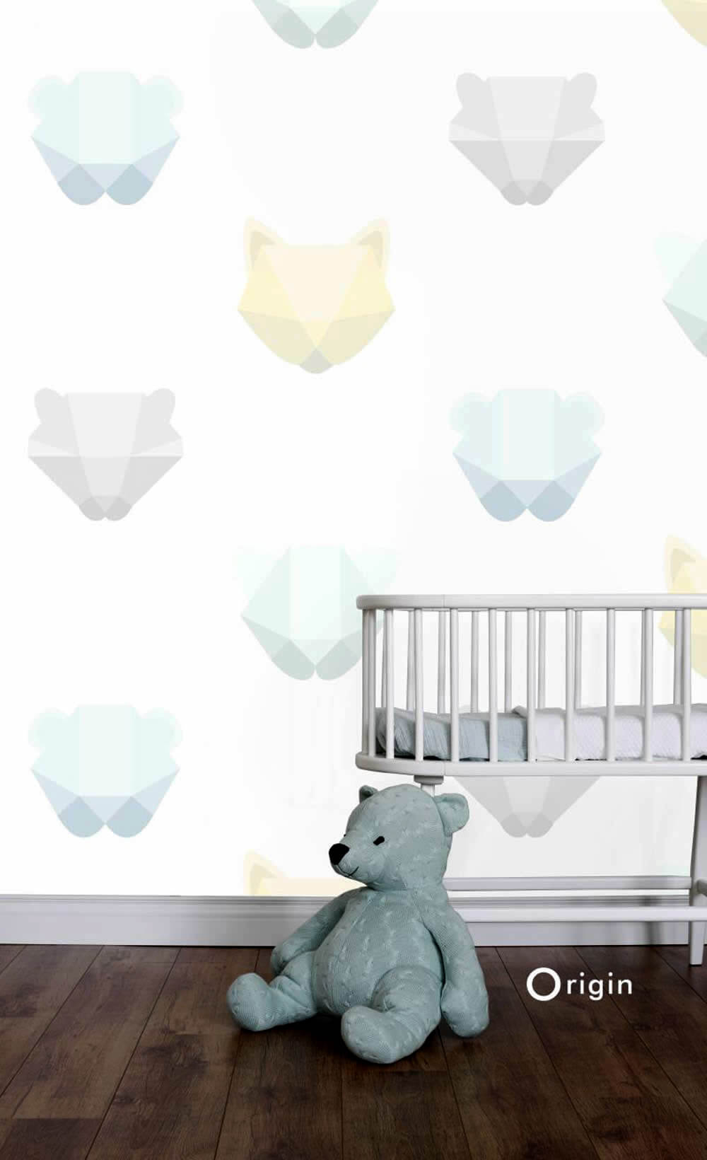 Niedliche Tierköpfe in Origami-Optik verwandeln das Babyzimmer als Wandbild eindrucksvoll.