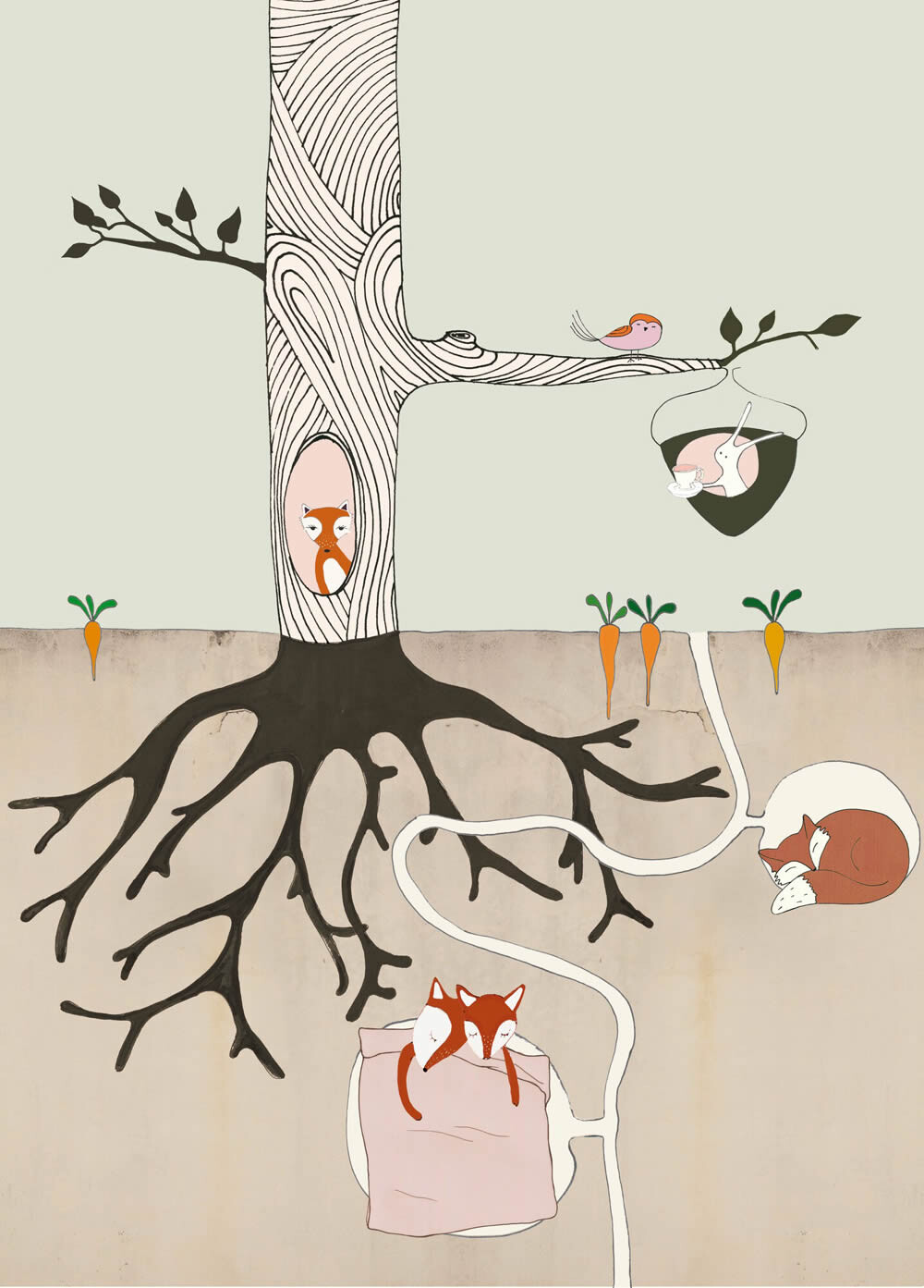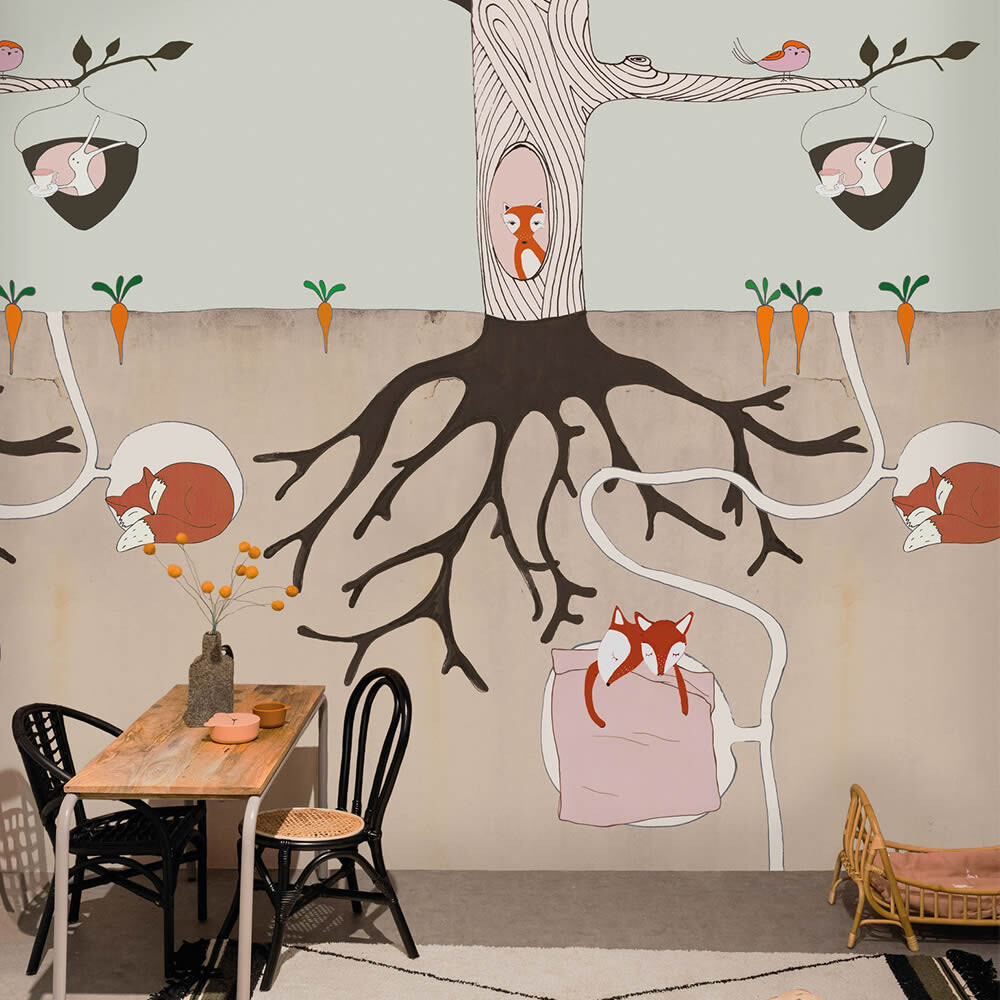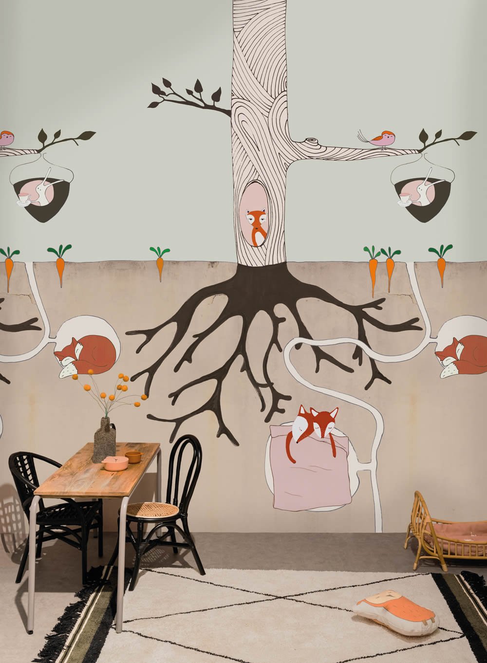 Produktinformationen "Wandbild Fuchsbau Waldtiere Füchse Baum beige erdfarben 557787"