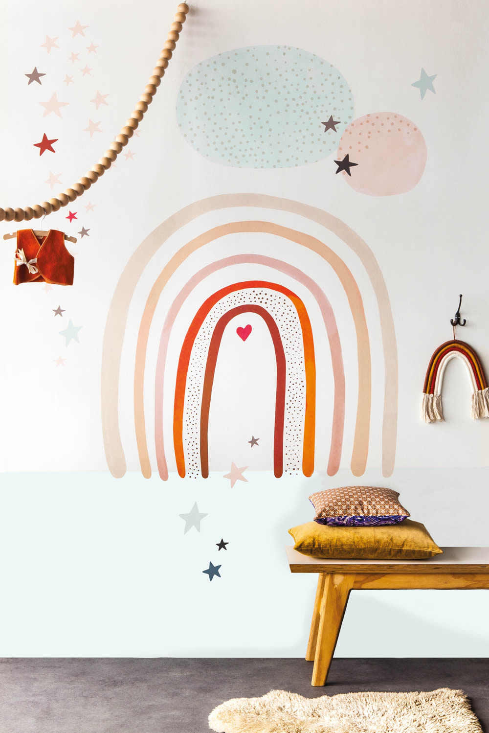 Wandbild 557381 für das Kinderzimmer zum Thema Skleine Sterne und Regenbogen in weiß. Fantasie für zauberhaftes Flair im Zimmer von Jungs und Mädchen. Struktur und Oberfläche sind glatt und matt und die Abmessungen sind 2,00 x 2,80 m. Werden Sie zum Innenarchitekt Ihres Kinderzimmers und gestalten Sie die Wände mit Tapetenprodukten aus Vlies aus der Kollektion Onszelf Stories von Rasch. Schaffen Sie ein weißes Spieleparadies für Babys und Kids in magisch und mit den Farben und Motiven dir Ihr Kind liebt. Mit einem Wandbild können Sie gemeinsam mit Ihrem Kind die Wände verschönern. Wandbilder von Rasch aus dem Trägermaterial Vlies sind besonders leicht zu verarbeiten, strapazierfähig und dank Wandklebetechnik kann der Kleister direkt auf die Wand aufgebracht werden. Regenbogen Wandbilder wirken als toller Hingucker im Kinderzimmer und zur Ergänzung bietet dieser Hersteller viele zum Motiv passende Tapeten für Babys und Kids.