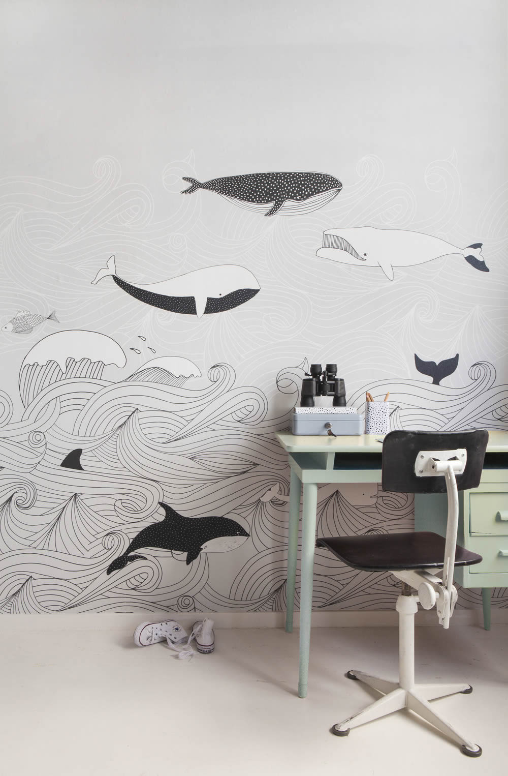 Das Wandbild 842531 für Kinder aus der Kollektion Onszelf Stories von Rasch, ist eine bezaubernde Skizzengrafik einer Unterwasserwelt mit Walen und Wellen in Schwarz-weiß und Grau. Blauwale, Buckelwale, Grauwale, Orcawale und Belugawale schwimmen elegant durch die sanften Wellen. Die Abmessungen sind 2,00 x 2,80 m. Die zurückhaltenden Farben verleihen dem Bild eine zeitlose Eleganz, die perfekt in jedes Kinderzimmer passt und auch im Teenageralter noch super angesagt ist. Dieses Wandbild wird nicht nur die Fantasie der kleinen Entdecker anregen, sondern auch einen Hauch von Ruhe und Schönheit in ihren Raum bringen. Die zarten Strichzeinungen der Wellen wirken dynamisch und beruhigend zugleich.