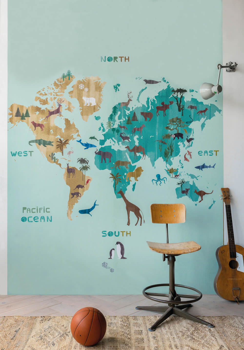 Wandbild 557749 aus der Kollektion Onszelf Stories mit Weltkarte- und Tiere der Erde -Motiven in der Farbgestaltung hellblau. Mit diesem Wandbild spielen und schlafen Ihre Kinder in einem Kinderzimmer im wissenschaftlichen Look und Träumen von Abenteuer. Dieses Wandbild hat eine matt und glatte Oberfläche und ist im Format 2,00 x 2,80 m. In dieser Kollektion Onszelf Stories gibt es viele weitere Artikel als farblich und zum Thema Weltkarte passende Ergänzungsprodukte. Abenteuer verwandeln das Kinderzimmer in ein niedliches, hellblaues Spieleparadies und bringen Kids Spaß beim Spielen. Mit Wandbildern können Sie die Wandgestaltung schnell und einfach ändern. Die Wandbilder sind aus dem Material Vlies und haben daher die gewohnten, hochwertigen Vorteile die dieses Material mit sich bringt. Weltkarte Wandbilder als Eyecatcher hinter dem Bett oder dem Sideboard im Kinderzimmer.