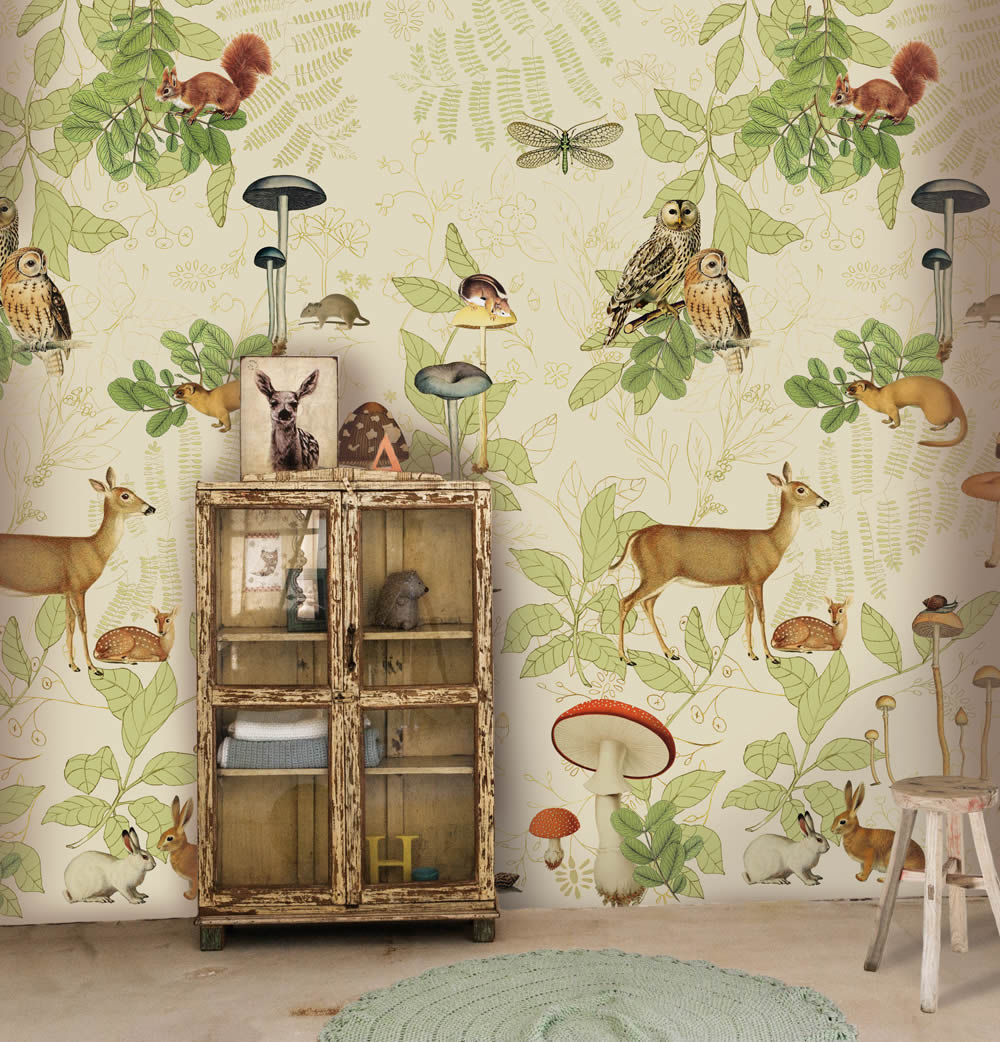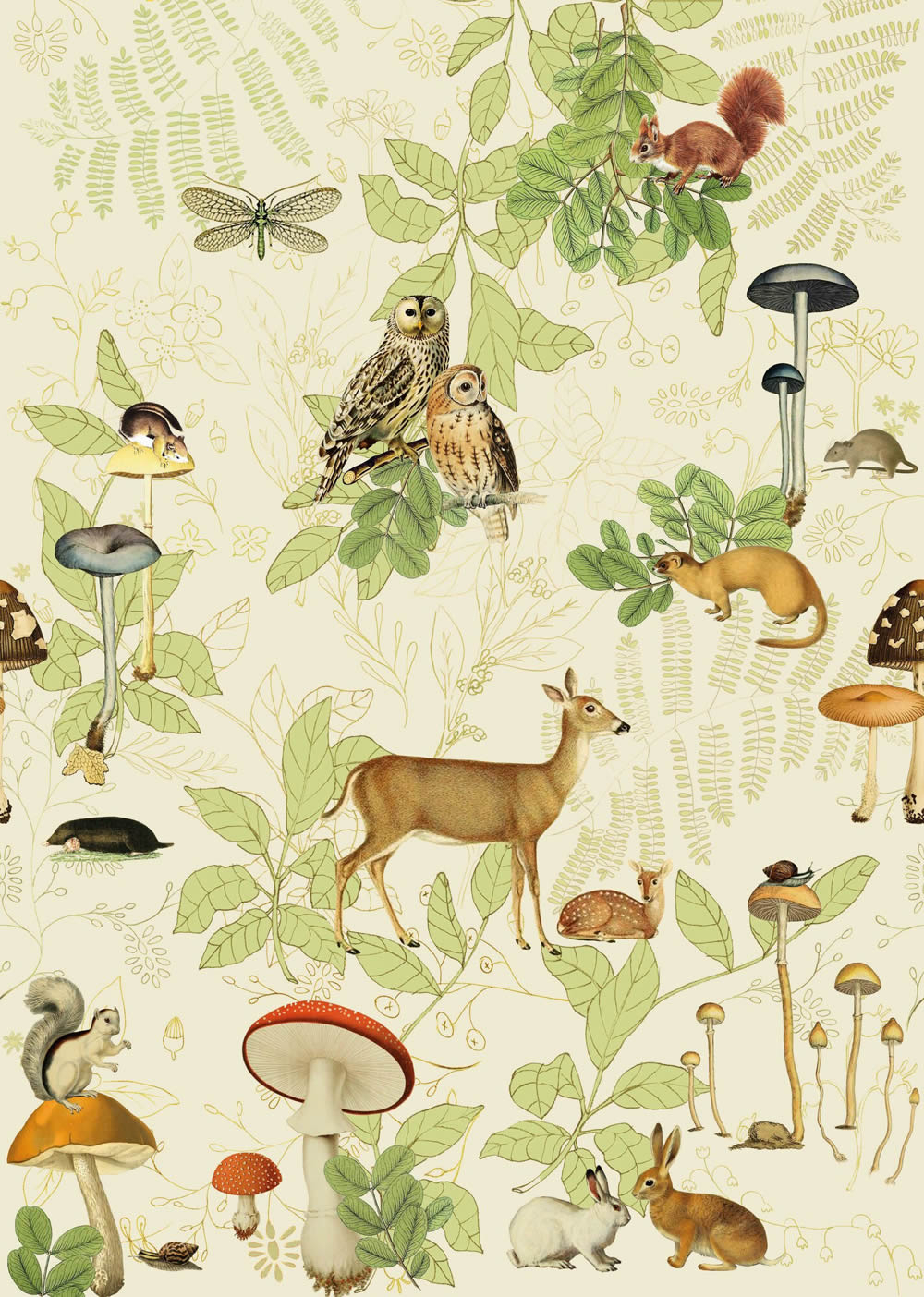 Wandbild Waldtiere Märchen Rehe Pilze Eulen Hasen cremebeige 557657