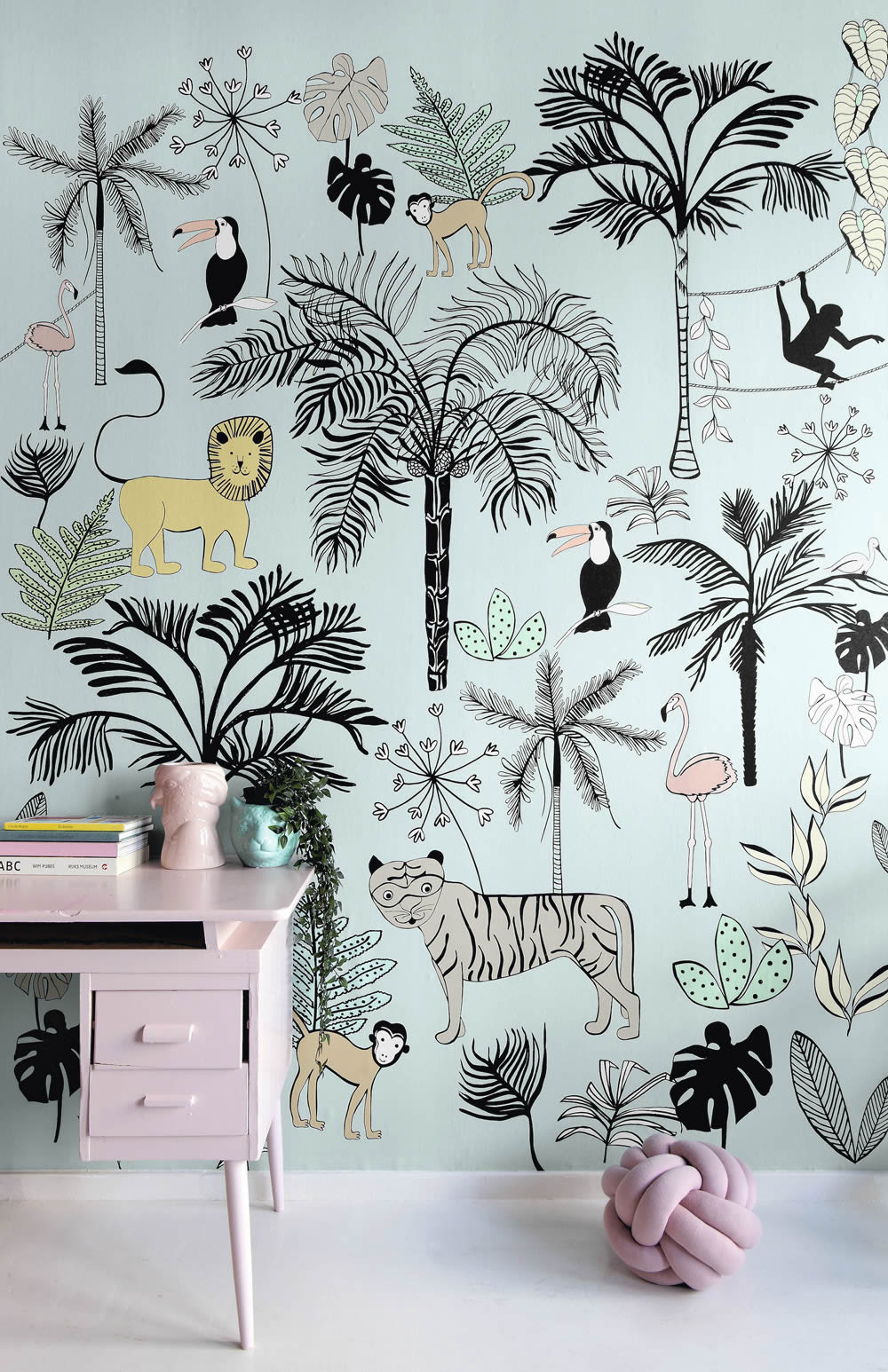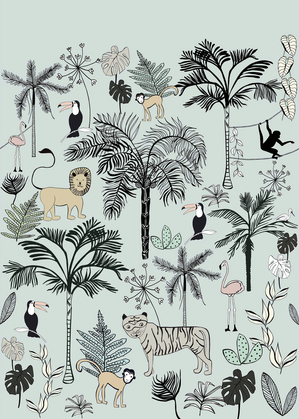 Ein Hellblaues Vlies-Wandbild zum Thema Dschungel. Wilde Tiere wie Löwen, Flamingos, Affen, Tieger und Kakadus bringen abenteuerliches Dschungel Flair ins Kinderzimmer. Kindertapeten mit wilden Tieren sind sowohl bei kleinen, also auch bei großen Kindern besonders beliebt. Das Wandbild bestet aus 4 Bahnen aus hochwertigem Tapetenvlies. Die Oberfläche ist glatt und matt und das Format ist 2,00 x 2,80 m. Mit diesem Wandbild 842197 lassen sich einzelne Wandbereiche im Kinderzimmer gezielt hervorheben, beispielsweise hinter dem Schreibtisch, dem Wetter oder einzelne Bereiche an einer großen leeren Wand.