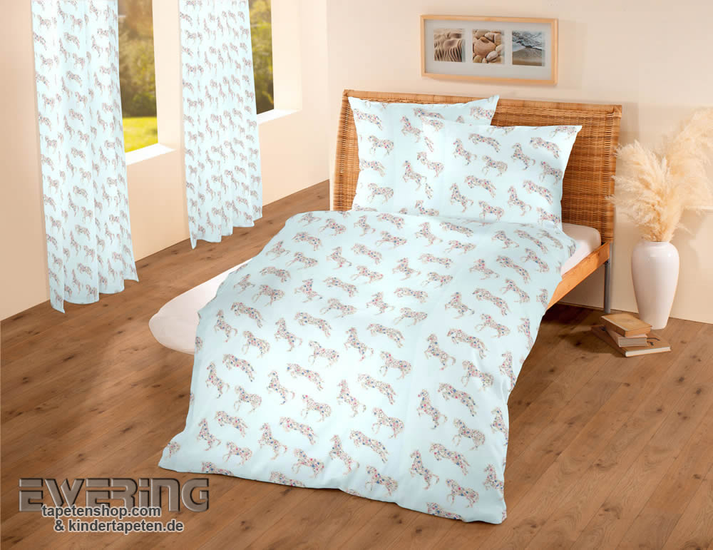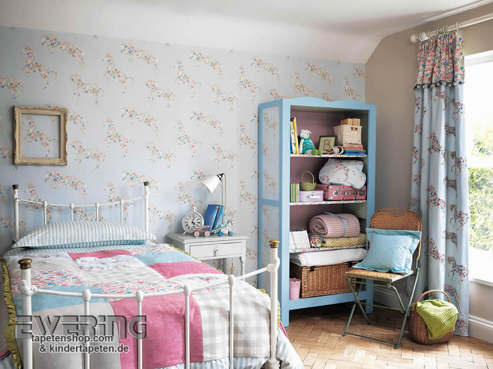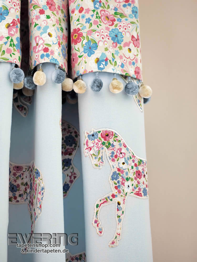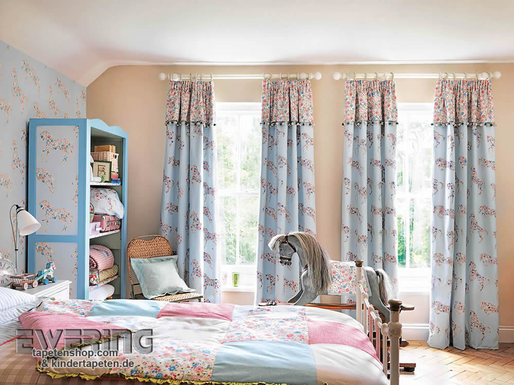 Mit Blumen verzierte Pferde bringen als Dekostoff einen leichten Vintage-Stil in das Mädchenzimmer.