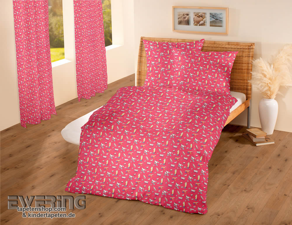 Ein roter Dekostoff mit vielen bunten Hunden lässt das Kinderzimmer schön aufleben.