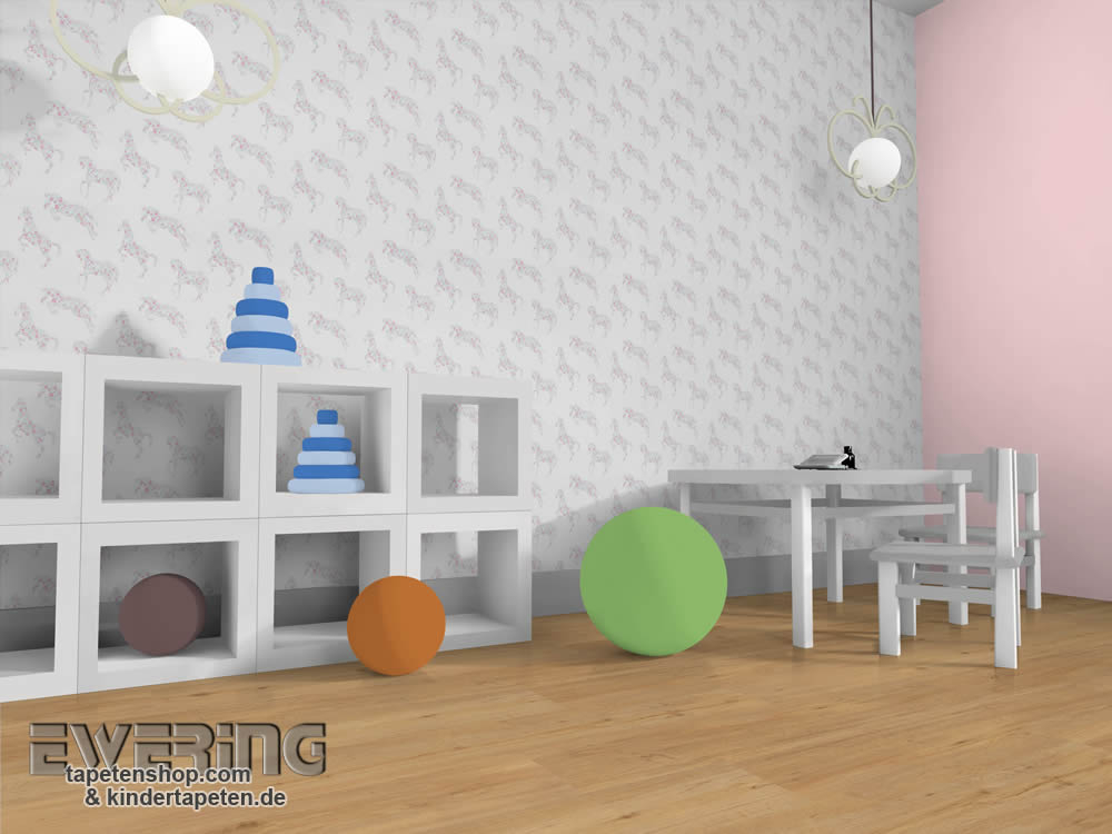 Mit Blumen verzierte Ponys galoppieren mit dieser Mustertapete über die Wand im Mädchenzimmer.