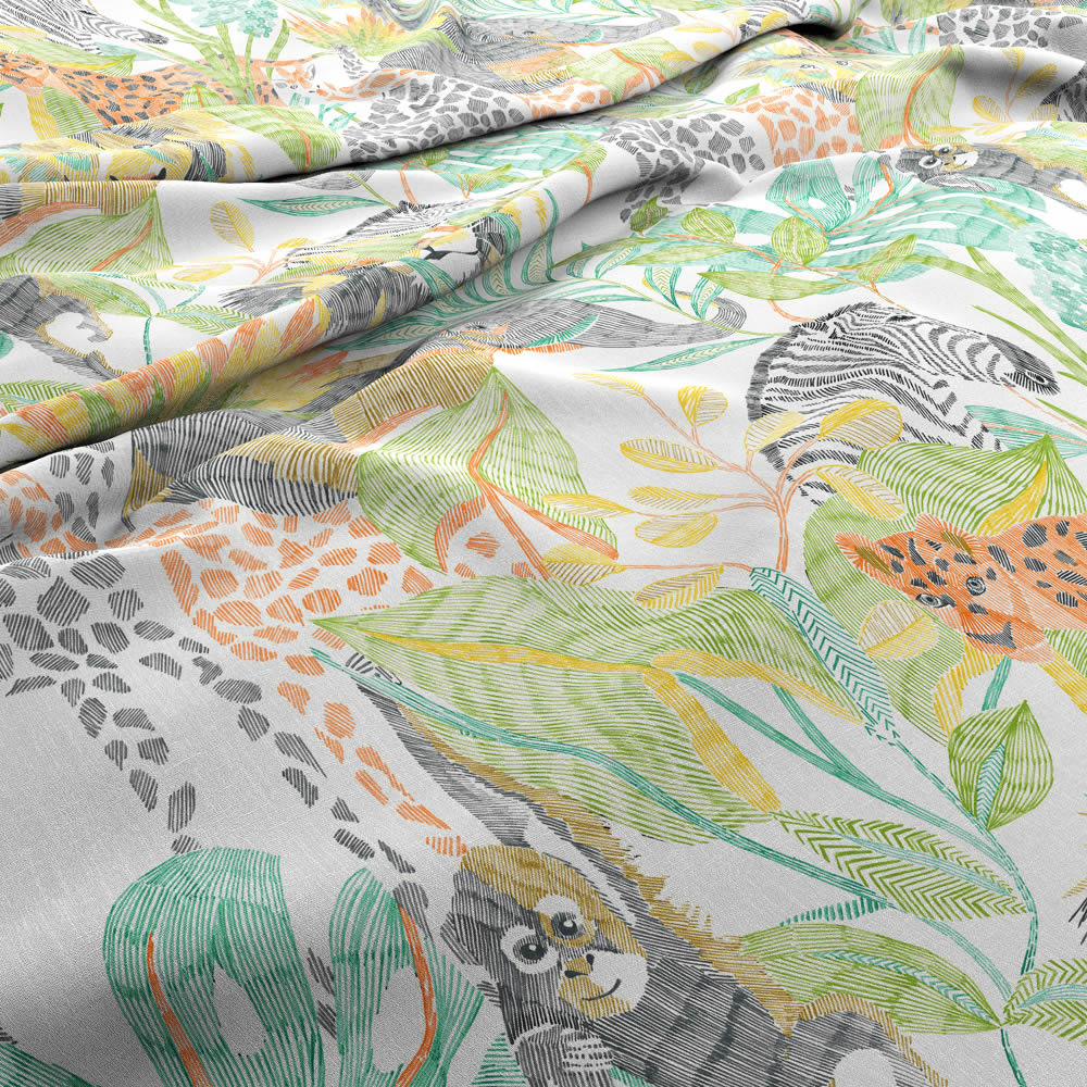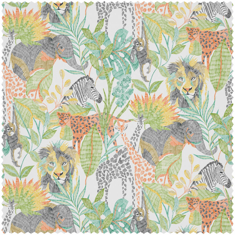 Stoff HLTF120945 für das Kinderzimmer zum Thema Afrika und Dschungelmotive in bunt und weiß. Lassen Sie Ihrer Kreativität freien Lauf. Wählen Sie einen Stoff passend zur Wandgestaltung und ergänzen Sie das Gestaltungskonzept. Farblich und vom Muster her passende Stoffe können, je nach Stoffart, als Kissenbezug, Bettwäsche, Betthimmel oder Gardine verarbeitet werden. Elefanten, Giraffen und Löwen-Muster schaffen ein malerisches Spieleparadies für Ihr Kind und passen zur Zielgruppe Jungs und Mädchen. Die Oberfläche des Stoffes ist matt und die Struktur ist glatt. Das Format beträgt 140 cm x lfm. Diese Kollektion hält eine Vielzahl weiterer passender abenteuerlicher Tapeten von Harlequin bereit. Dschungelmotive Stoff gestalten das Kinderzimmer kindgerecht und abenteuerlich in bunt und weiß und sorgen für einen altersgerechten Rückzugsort für Kids. Bunt und weiße Stoffe bieten die Möglichkeit die Wände passend zu den Gardinen und Teppichen im Kinderzimmer zu gestalten. Dschungelmotive Stoff lassen einzelne Wände lebendig werden und setzen die Lieblingsmotive von Kids somit ganz besonders in Szene.